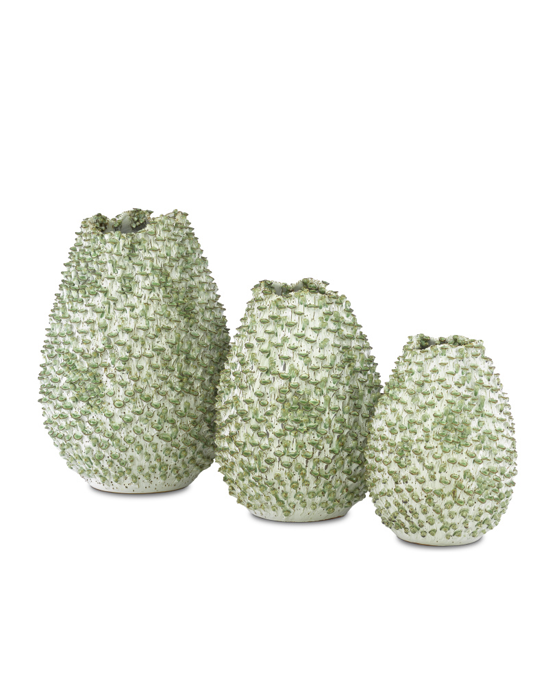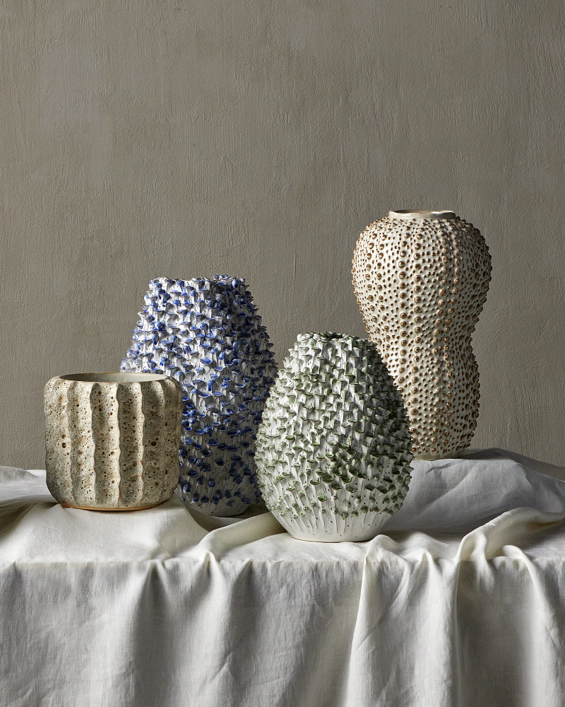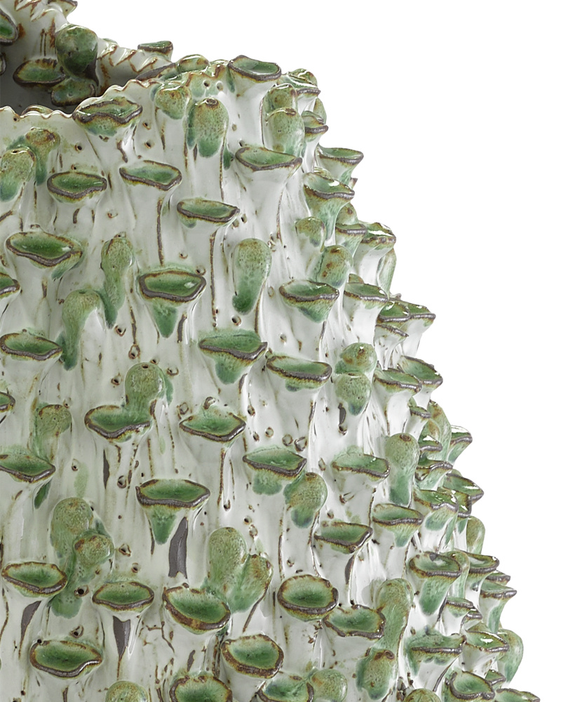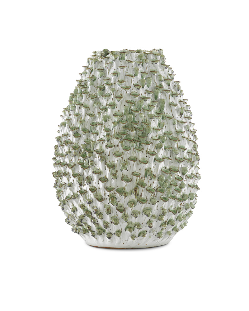 Our Milione Small Green Vase is made by a group of women who live at the border of Burma and Thailand. The black terracotta vase has a white glazing and tiny green leaves, each applied by hand to the side of the vase. This white vase is truly an artisanal piece, as each leaf is hand-glazed with a very subtle green glazing.