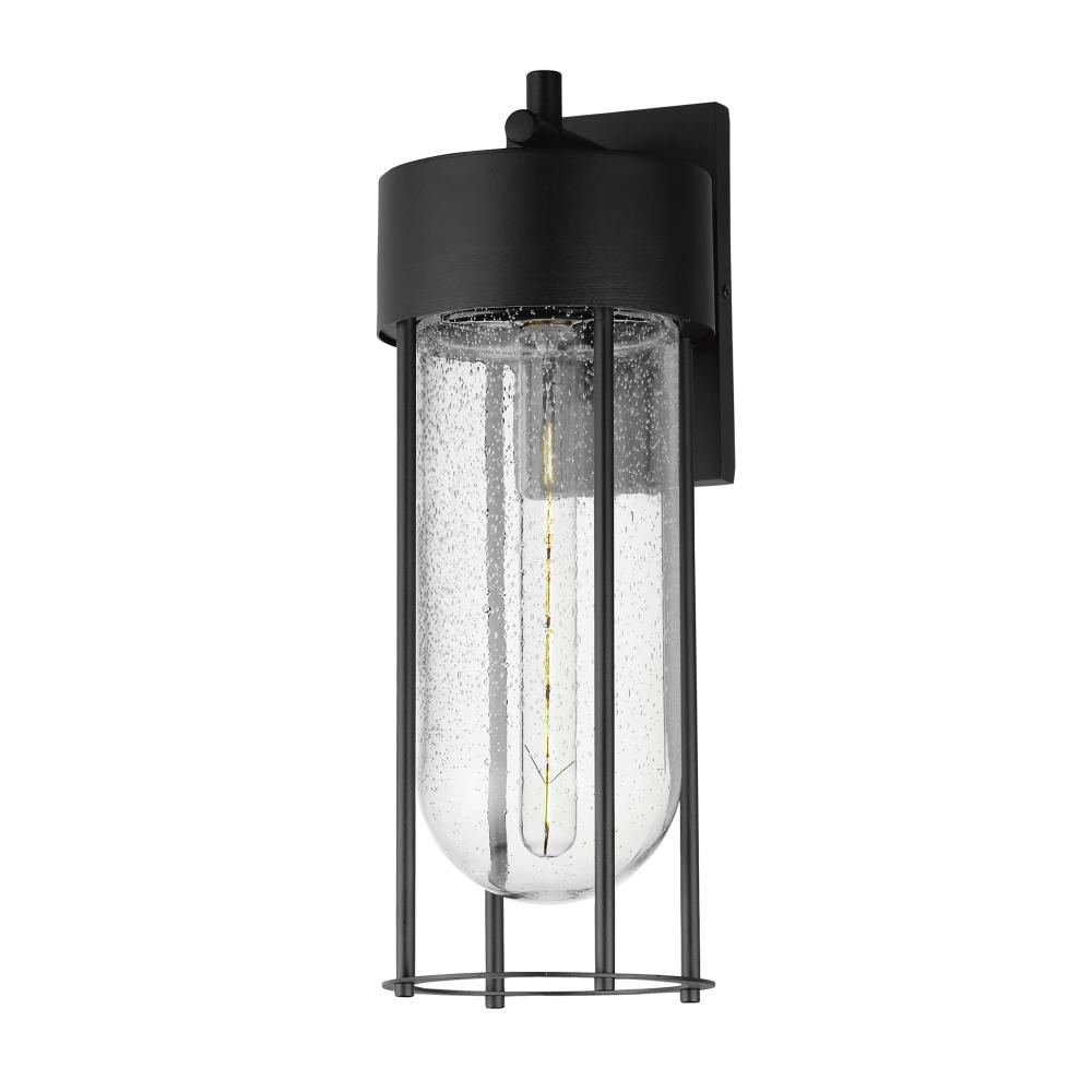 Clean and contemporary, this series of wet location rated outdoor sconces features a capsule of Clear Seeded glass encased within a cage of matte Black outdoor rated powder coat. The transitional appeal of the design pairs well in applications both modern