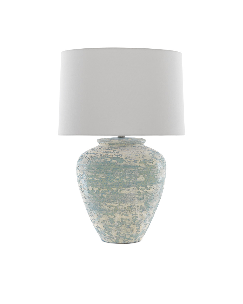 The ginger-jar shape of the Mimi Table Lamp is just one of its lovely features: the aqua and cream surface is another. The turquoise lamp, which will bring textural patina to a room, is topped with a white shantung shade.