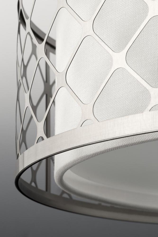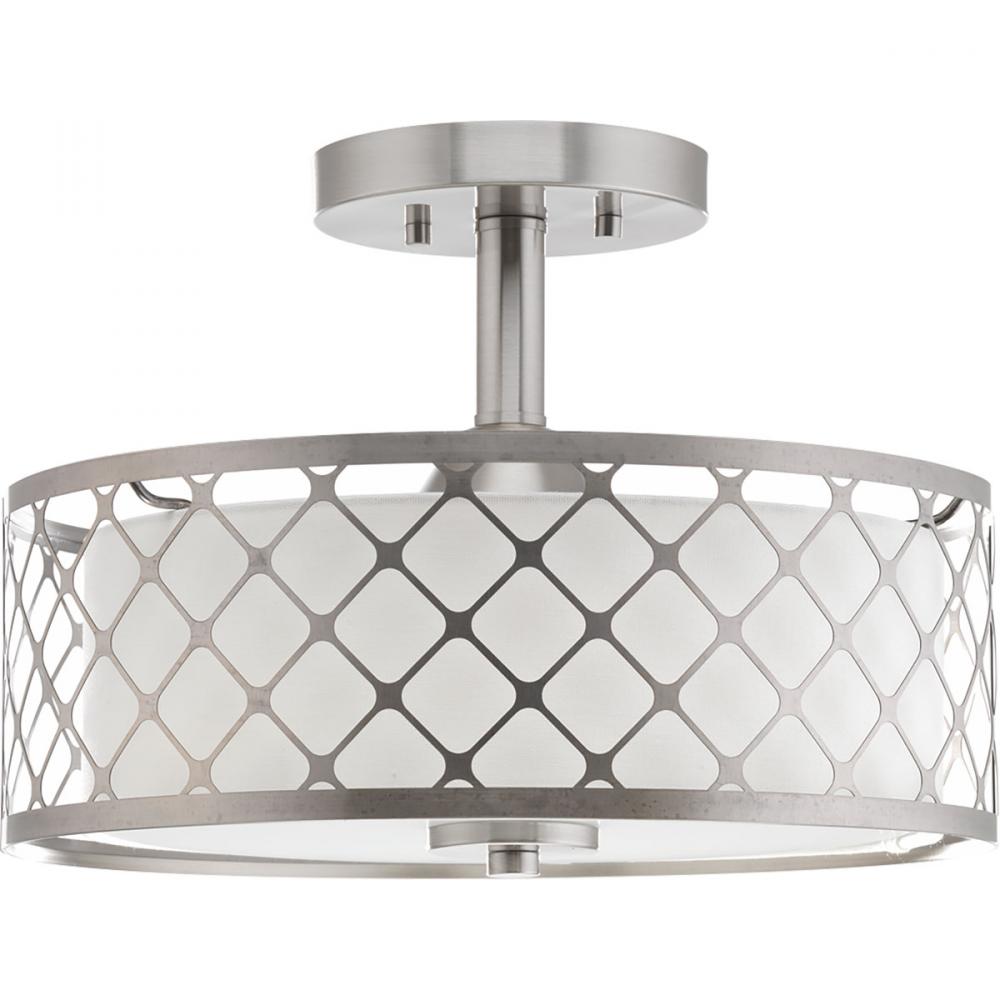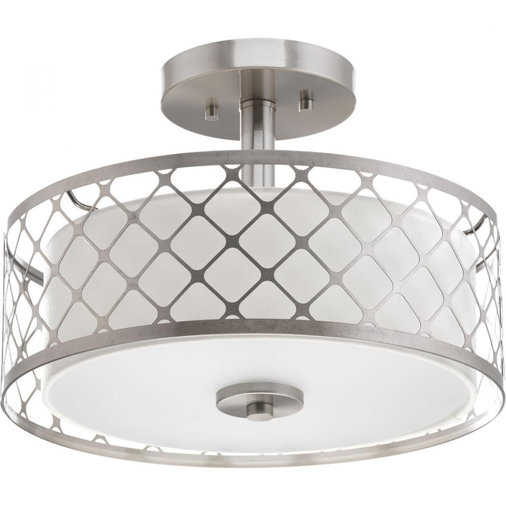 One-light LED semi-flush mount features a modern square pattern in a Brushed Nickel metal shade that surrounds a summer linen fabric shade with a glass diffuser. 3000K, 90+ CRI 1,211 Lumens 71.2 lumen/watt.