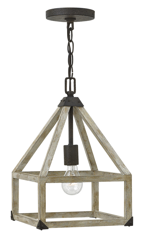 Emilie exudes a cottage-chic style while retaining a modern sensibility. The bold openwork design in solid, white washed wood blends organic charm with rustic elegance. Vintage lamps ring a center column while rivet accents highlight corner details.