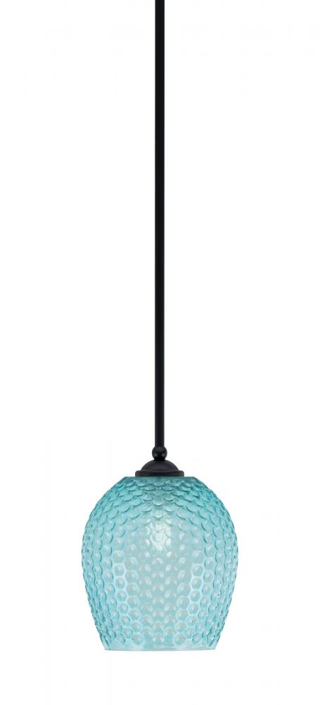 Zilo Stem Hung Mini Pendant Shown In Matte Black Finish With 7.5 Turquoise Textured Glass