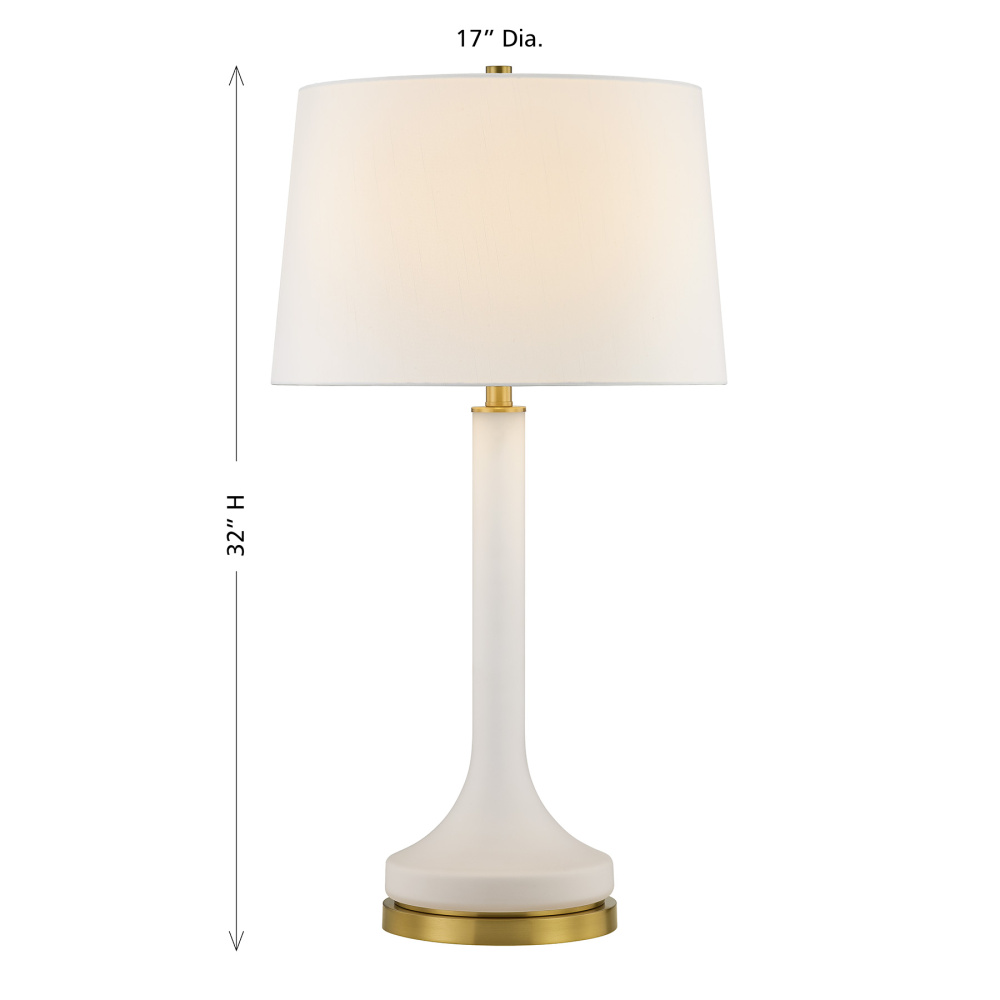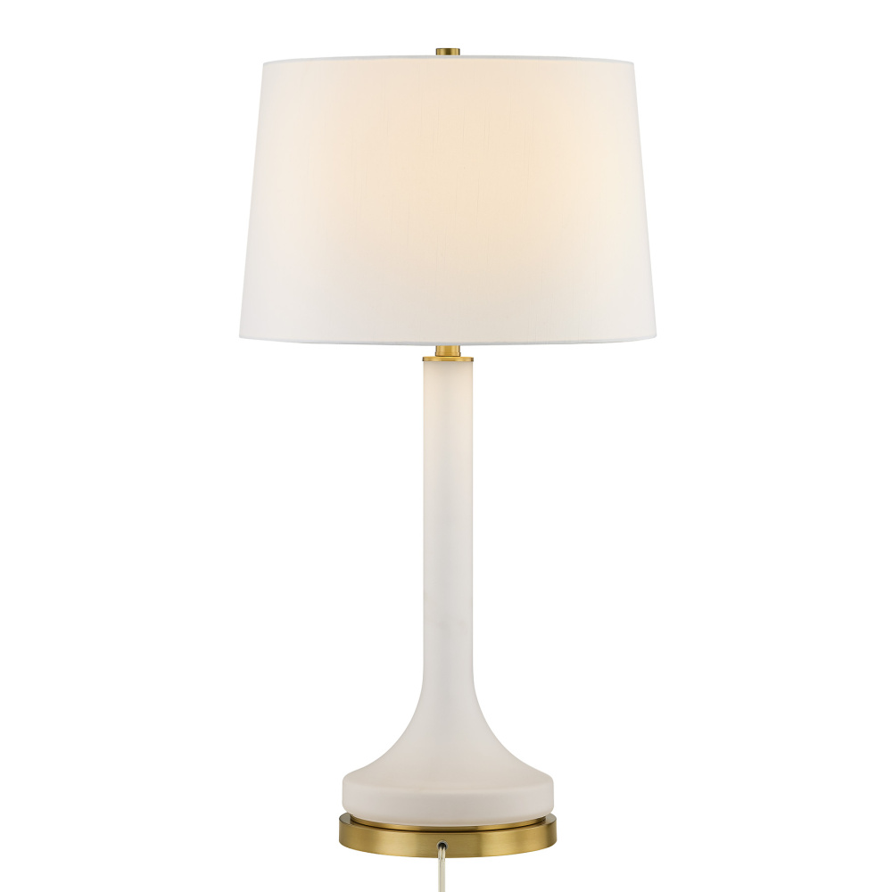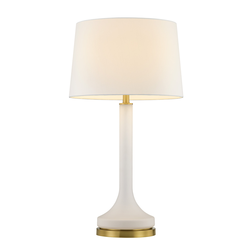 The Savoy House Miramar 1-light table lamp was designed by Dann Foley, an award-winning interior designer with a reputation for style, taste and quality. It offers a timeless, calming presence through its frosted glass body, white fabric shade and Warm Brass finish. Miramar is 32" in height and 17" in width. It uses one standard size bulb of up to 100 watts. Bulb not included.