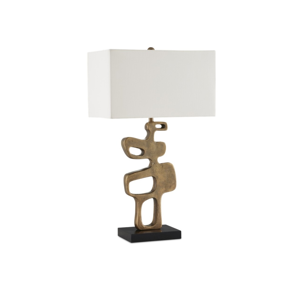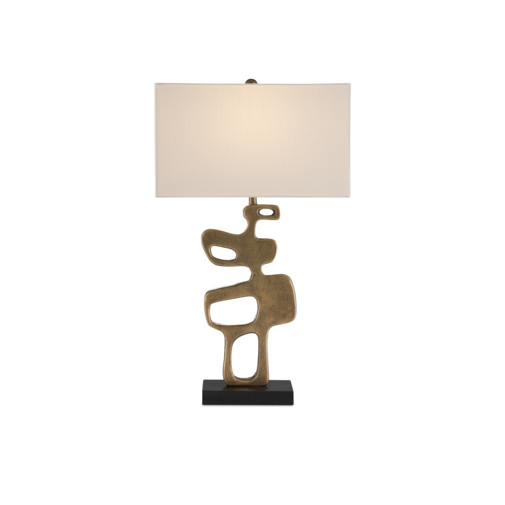 The Mithra Brass Table Lamp features a powerful brutalist profile. The cast aluminum lamp showcases the unique attributes of foundry pieces, such as the drifts of stippling on the metal's surface. The antique brass finish highlights the texture, giving the gold lamp the feel of a vintage piece. Inspired by a mid-century modern sculpture, the design is complemented by a honed granite base and an off-white shantung shade, which serve as clean-lined elements that allow the sculptural form to take center stage.