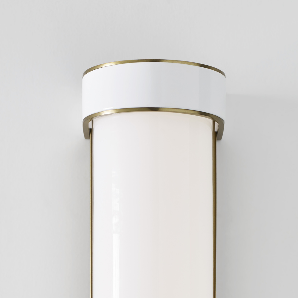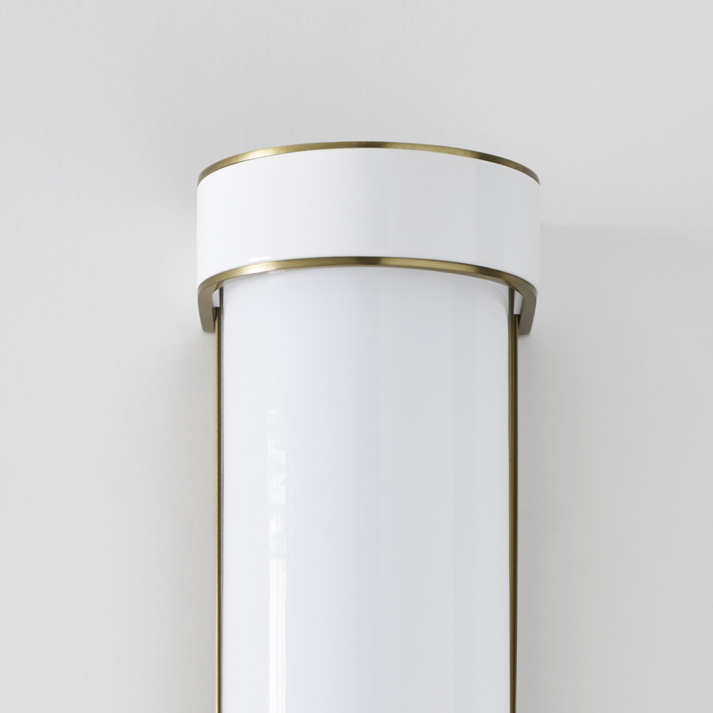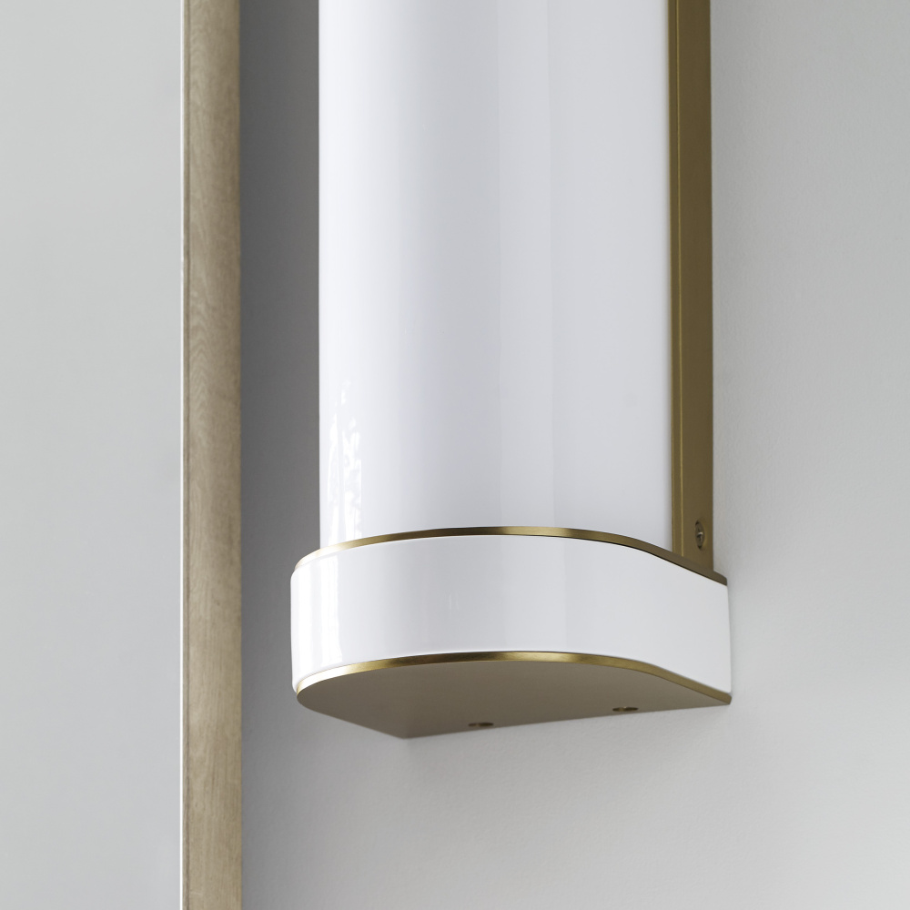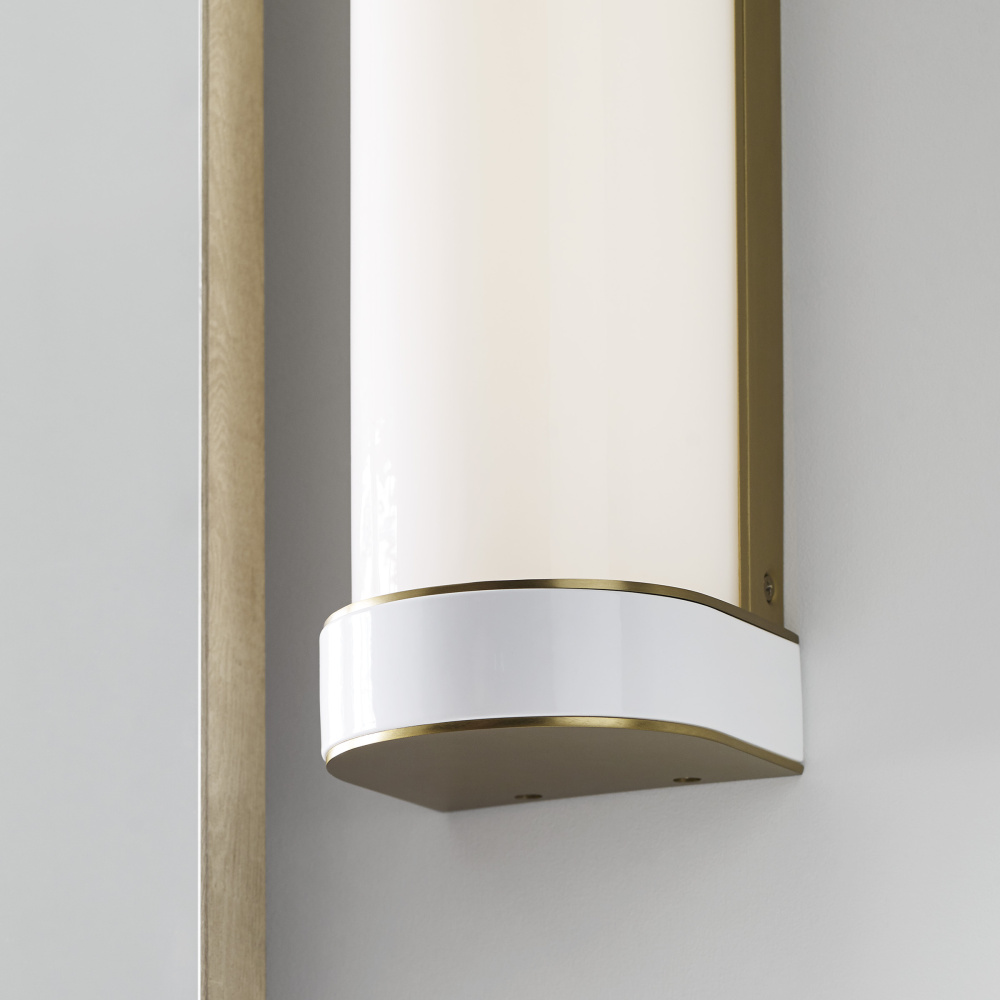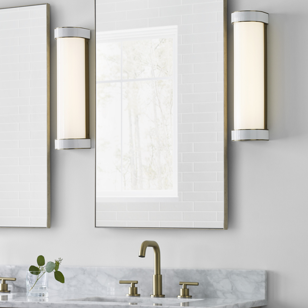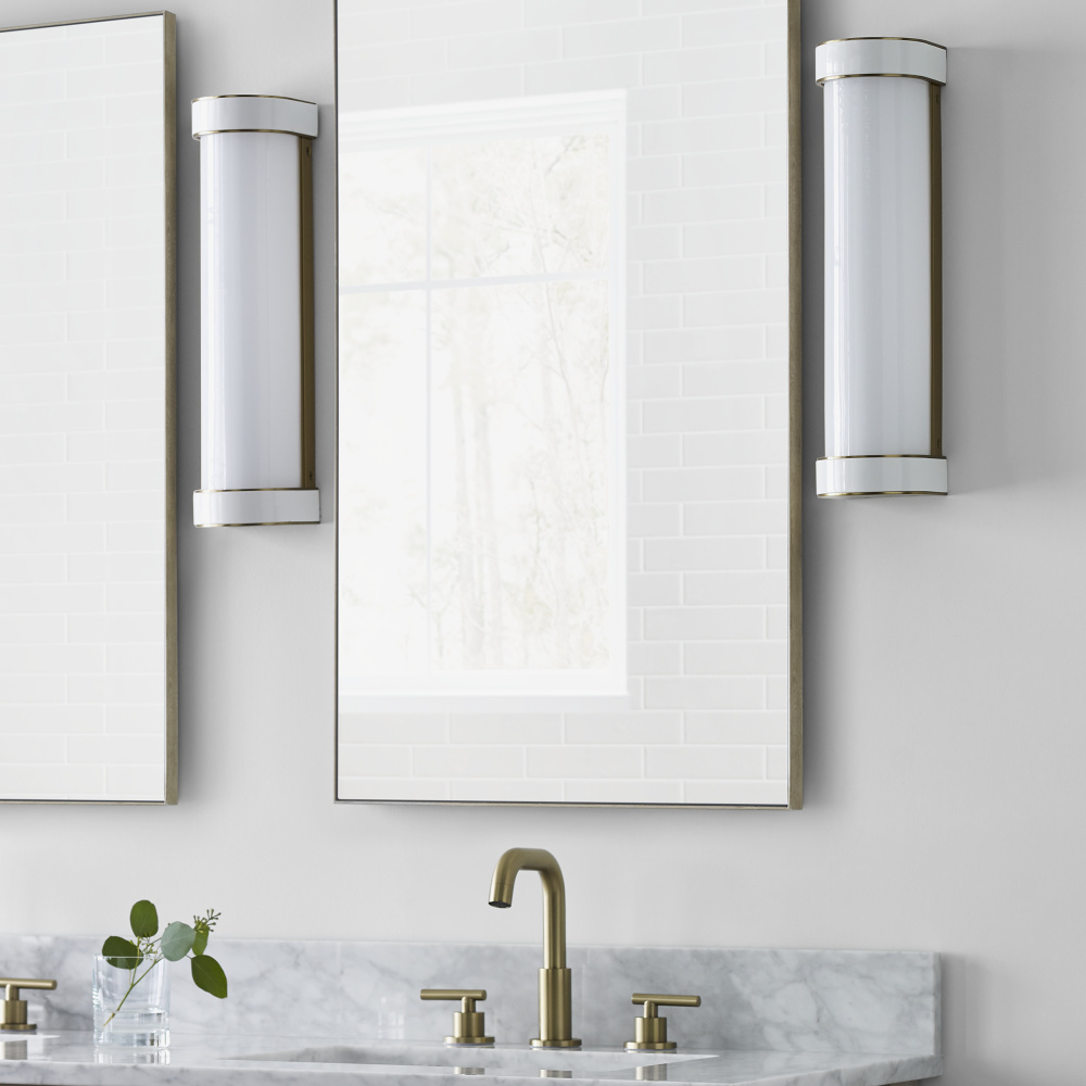 The Monroe vanity is inspired by graphic enameled metal jewelry and decorative accessories from kate spade with a nod to late 50s atomic era colorful designs. Monroe exhibits clean lighting profiles and dressed them up with painted sections and metal accents. Available in a Burnished Brass and Polished Nickel finish.