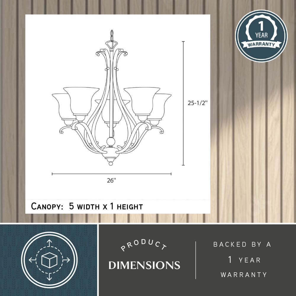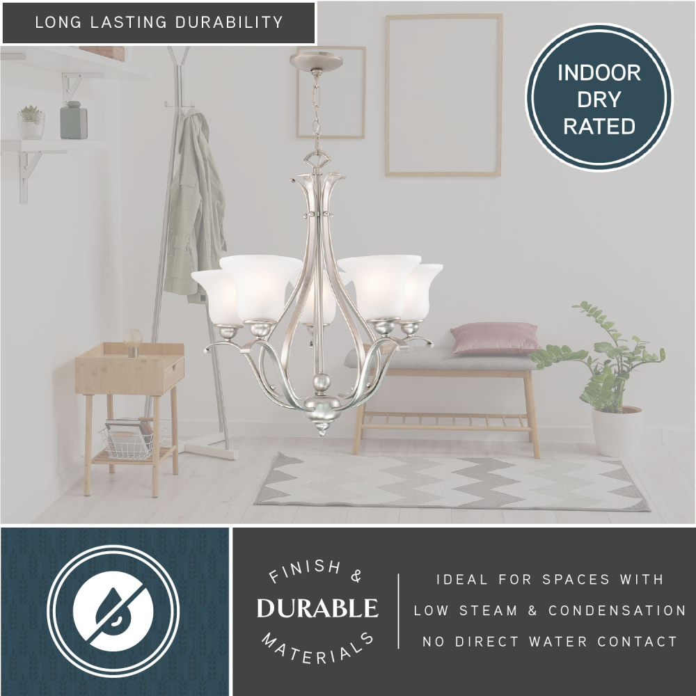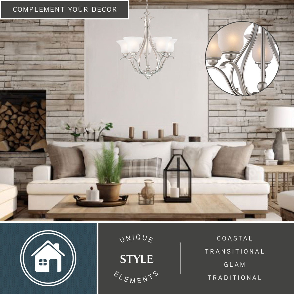 The soft traditional lines of the Monrovia collection allow you to combine styles within your home without compromising on design. The brushed nickel finish and white frosted seeded glass add a certain level of sophistication and elegance that is rare to achieve. Update your look with a hint of class. This fixture is part of a full collection with coordinating pieces to decorate any room in the house. This chandelier is ideal for kitchens, dining areas, and foyers.