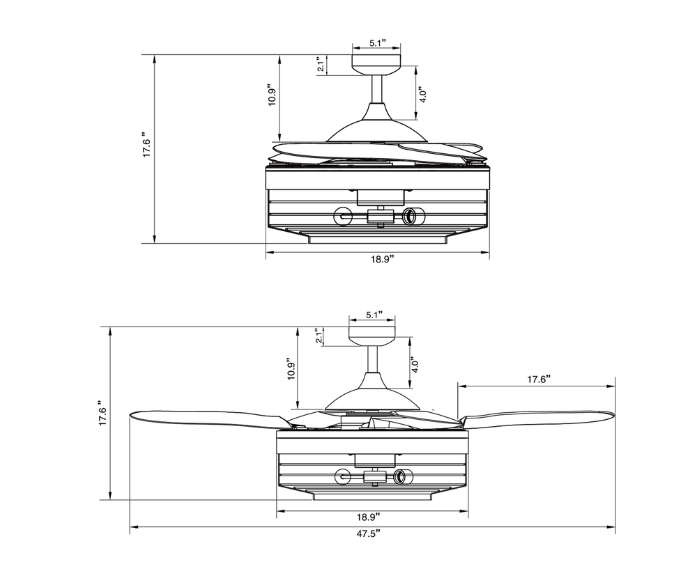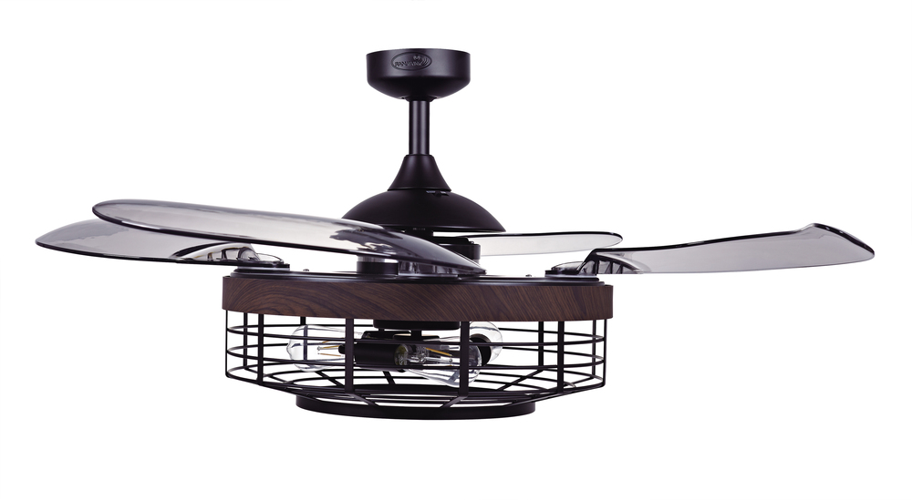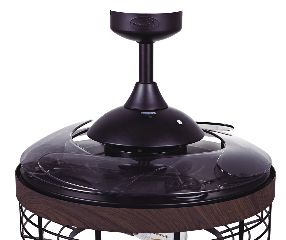 The Australian Original FANAWAY Montclair Black with Koa Trim and Smoke Blades is an advanced ceiling fan with unique aesthetics and energy efficient design. Switched off, the traditionally intrusive fan blades automatically retract and conceal, transforming the unit into a modern industrial pendant. It creates open space in the room environment, accumulates less dust, and is unobtrusive and versatile to visually integrate into all rooms of you home. The fan comes with 3 dimmable LED vintage bulbs, 3 speed remote control, winter/summer mode and wall mount for you to personalize your experience. The star of this Fanaway design is the light kit which has a hand-crafted industrial steel cage with a hand-painted koa wood trim. The 3 dimmable vintages LED bulbs completes the rustic modern feel and is sure to add that designer look to any room in your home. Additional downrods lengths sold separately: 12", 24" and 36" - 51106012, 51106018, 51106024, 51106036. US Patent 8317470, US Patent 8807938, US Patent 8790085, US Patent 9255584, US Patent 8851841.Features:Set includes: One (1) ceiling fan with remote control. Material: Metal (fan housing) and PC - Polycarbonate (blades). Finish: Black with Koa Trim and Smoke Blades. Ceiling fan dimensions: 17.72 inches high x 48 inches wide x 48 inches deep. Blade dimensions: 17.7 inches length x 4.1 inches width; Blade color: Smoke. Summer/Winter mode: Yes. Motor size (inch): D153 x 15. Airflow(CFM): 4172.69. Number of speed: 3. Power Consumption Average(wattage): 60. Motor Wattage: 60W. Include 3 x 4.5W E26 Based ST19 LED bulbs included; each bulb 360LM, 2700K. Socket: E26; Dimmable. RPM H/M/L (motor speed): 223/163/122. Fan Watts when used at high speed: 60W. Voltage: 110V. This product will ship to you in one (1) box.Accessories pictured are NOT included.Assembly required.