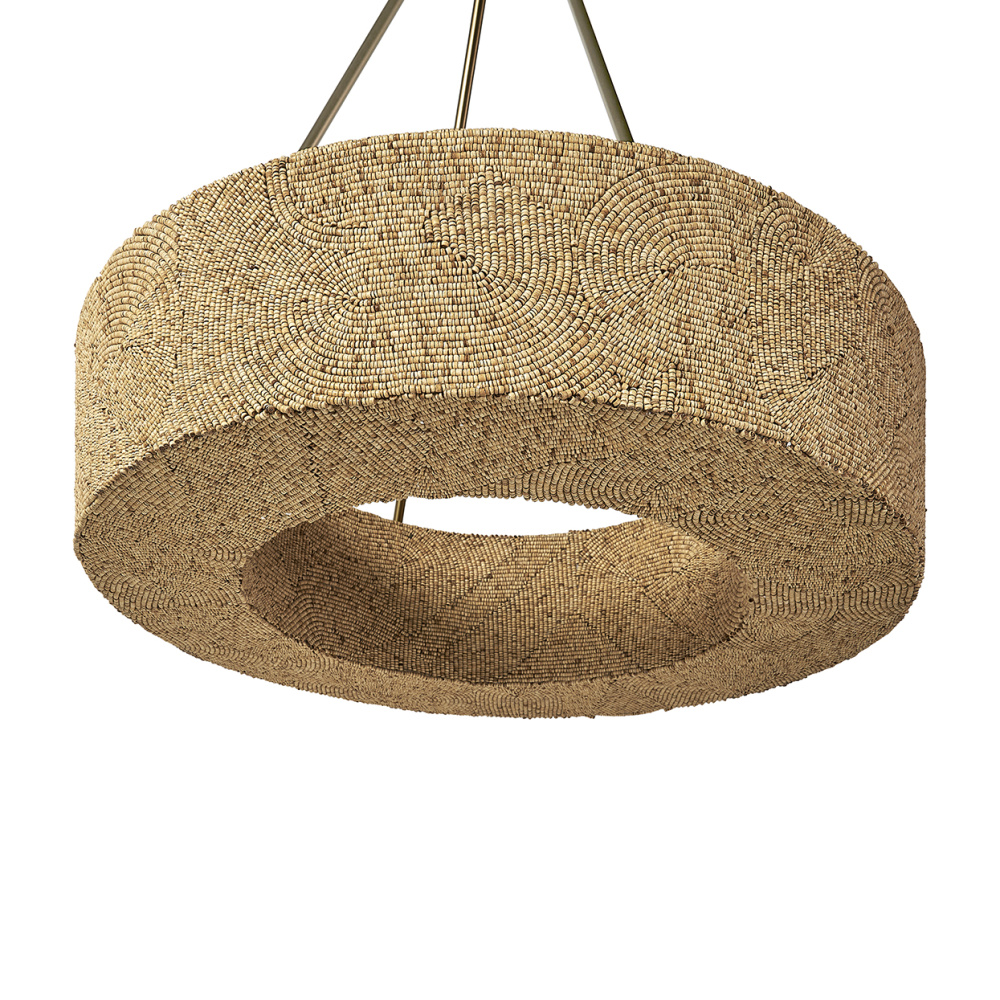 Natural coco beads embedded in a ring of fiberglass create a warm atmospheric glow, suspended by antique brass finished metal rods. Antique brass finished hanging canopy kit includes 4 x 12" rods, 4 x 6" rods and 4 x 4" rods for customizable hanging heigh
