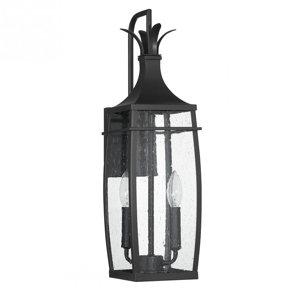 A hint of nature-inspired detailing decorates the top of this Savoy House Montpelier 2-light outdoor wall light. Its slightly curved structure features panes of clear seeded glass and is finished in a classic matte black. Montpelier is 22" in height, 6.25" in width and extends 8.25" from the wall. It uses 2 candelabra size bulbs with a max of 40 watts per bulb (bulbs not included).
