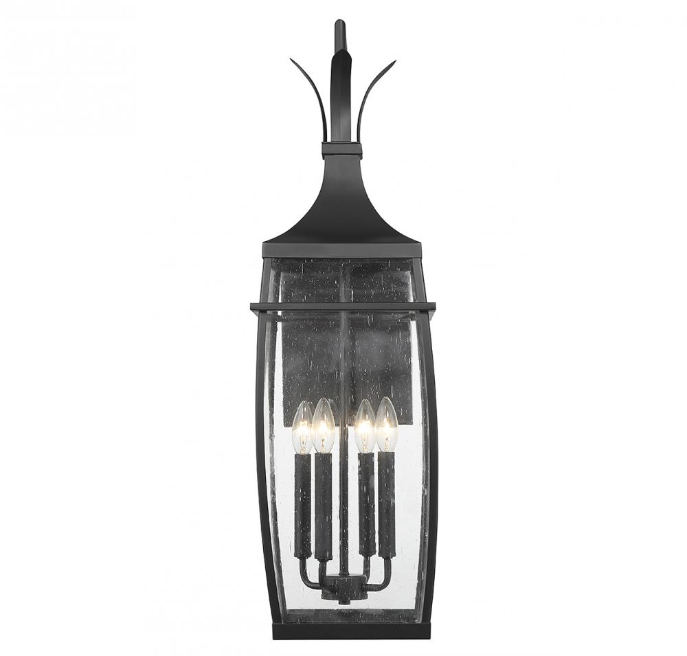 A hint of nature-inspired detailing decorates the top of this Savoy House Montpelier 4-light outdoor wall light. Its slightly curved structure features panes of clear seeded glass and is finished in a classic matte black. Montpelier is 32" in height, 9.5" in width and extends 12" from the wall. It uses 4 candelabra size bulbs with a max of 40 watts per bulb (bulbs not included).