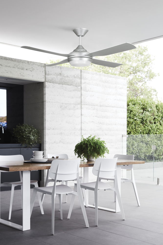 The Lucci Air Moonah 52-inch 4 blade fan and LED light in silver with silver blades. The Lucci Air Moonah comes with high-performance ABS blades, diecast motor, 3-speed remote control with wall holster. The integrated non-dimmable LED light kit will brighten your room or patio with 890 lumens in a 3000k warm white light. The Lucci Air Moonah is covered by our lifetime limited warranty for years of breezy indoor or outdoor comfort. Additional downrods to customize the height of your fan sold separately. Features: Set includes: One (1) ceiling fan with remote control Material: ABS and Steel Finish: Silver Ceiling fan dimensions: 12 inches high x 52 inches wide x 52 inches deep Blade dimensions: 22 inches length x 5.5 inches width; Blade color: Silver Summer/Winter mode: Yes D7x0.6 motor Airflow(CFM): 5207.85 Number of speed: 3 Power Consumption Average(wattage): 75 Motor Wattage: 75W Include 18W LED, 1300LM, 3000k Non Dimmable RPM H/M/L (motor speed): 215 Fan Watts when used at high speed: 65W Voltage: 120Vac, 60Hz This product will ship to you in one (1) box. Accessories pictured are NOT included. Assembly required.