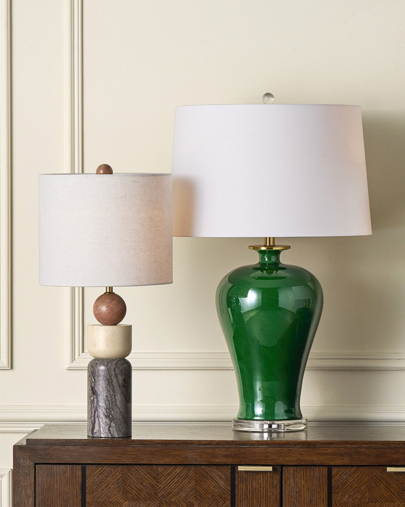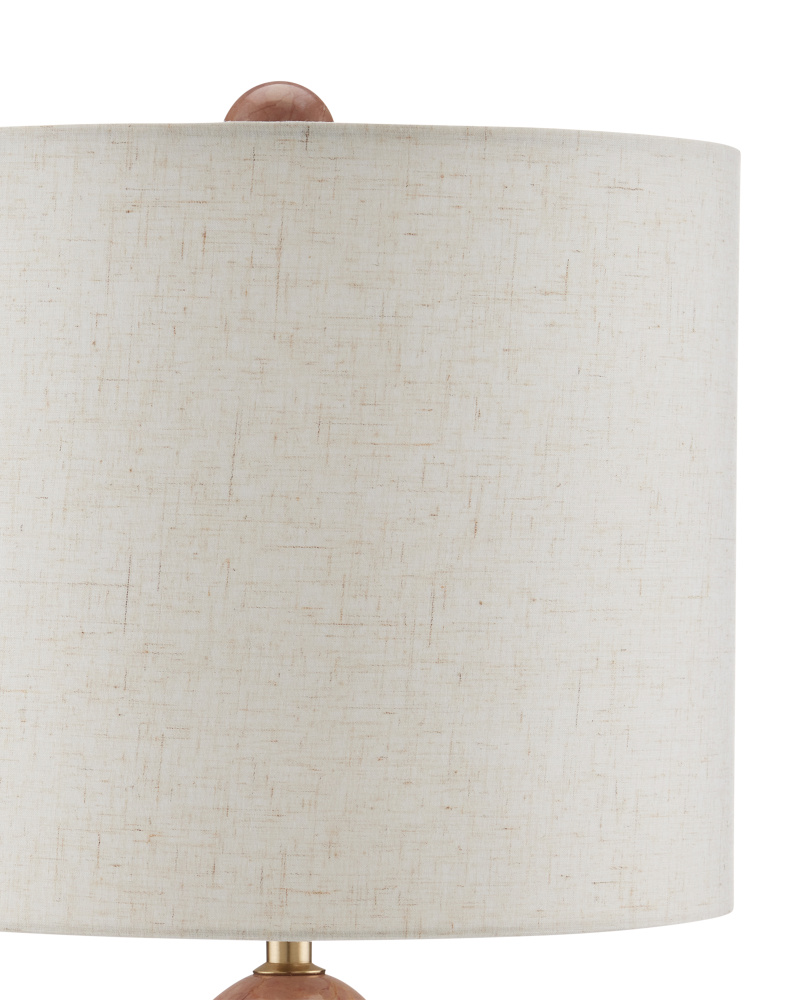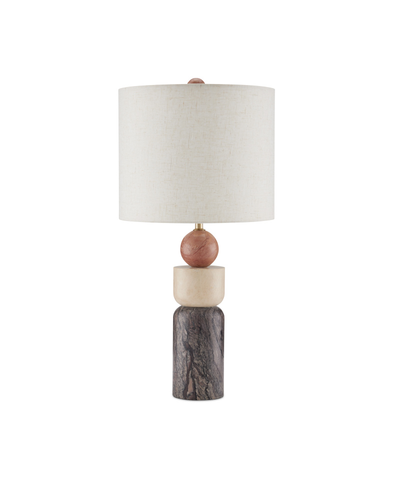 A delightfully geometric composition, the Morena Table Lamp is made of sections of Rosa Cappuccino Marble, Camello Neve Marble, and Breccia Marble. The multi-colored lamp is fitted with a beige poplin shade that is fastened with an orb finial, which matches the top Rosa Cappuccino marble ball. Because this contemporary lamp is made of natural stone, colors and patterns will vary.