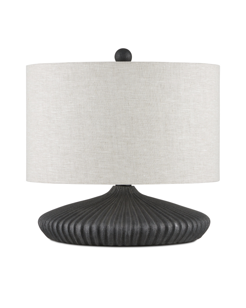 The Mythmaker Table Lamp lives up to its name, as its squashed circular body is made of terracotta in a mix of satin black and black granite finishes that make it look as if it has been forged of iron. Though there is a slight aged feel that brings the lamp added texture, it is still modern in its lines. The oversized shade paired with the flatness of the body is a stylish design detail, as is the matching finial that fastens the shade to the lamp.