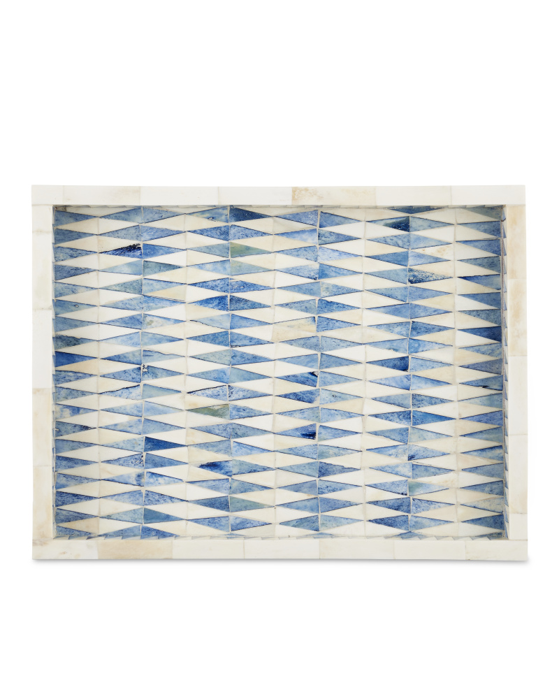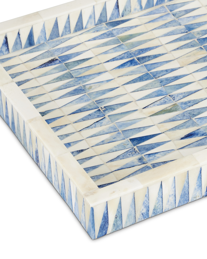 The Nadene Tray is a decorative tray made of alternating colors of bone. The jagged pattern is created when blue and ivory colored bone is hand-applied to the surface, which makes the blue tray an artisanal accessory that packs a textural punch. Place this lovely decorative accessory on a kitchen island or a buffet and it will be a dynamic accent whether or not it holds any meal-specific elements.