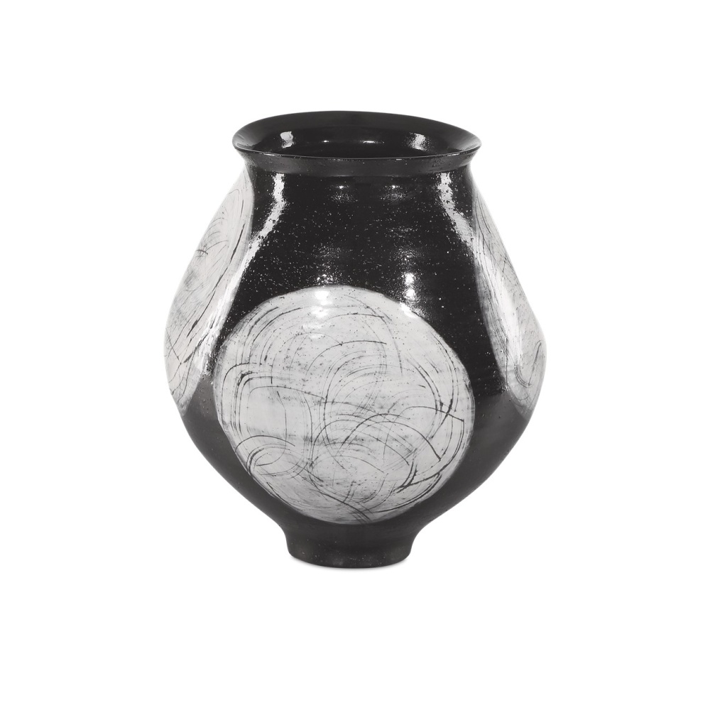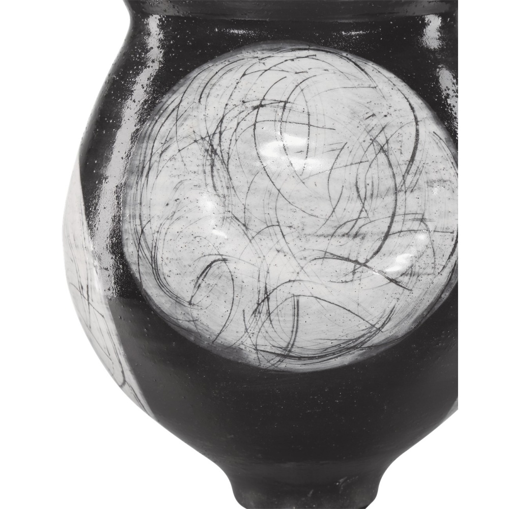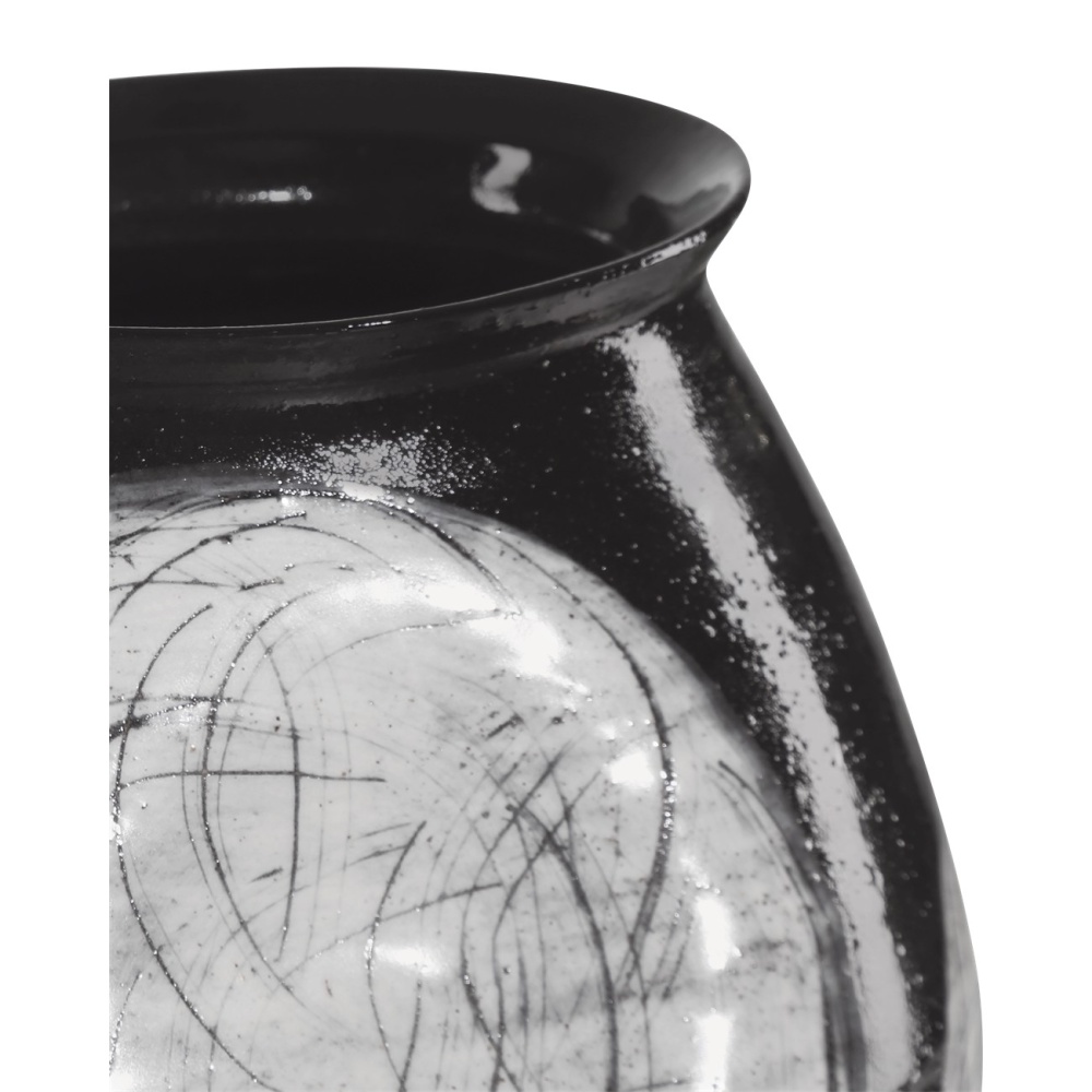 The Nakamura Vase is an artisanal creation made of porcelain that is hand-thrown, hand-glazed, and hand-decorated. The pale gray and black vessel has intentional pitting on the surface. Because the motifs on this vase are created by hand, each will vary slightly as each artist puts his brush to the surface of the glazed material in his or her own unique way. A design detail worth noting is how the vase sits on a smaller rounded bottom, while the irregular oval top reflects the swell of the vessel's shape.
