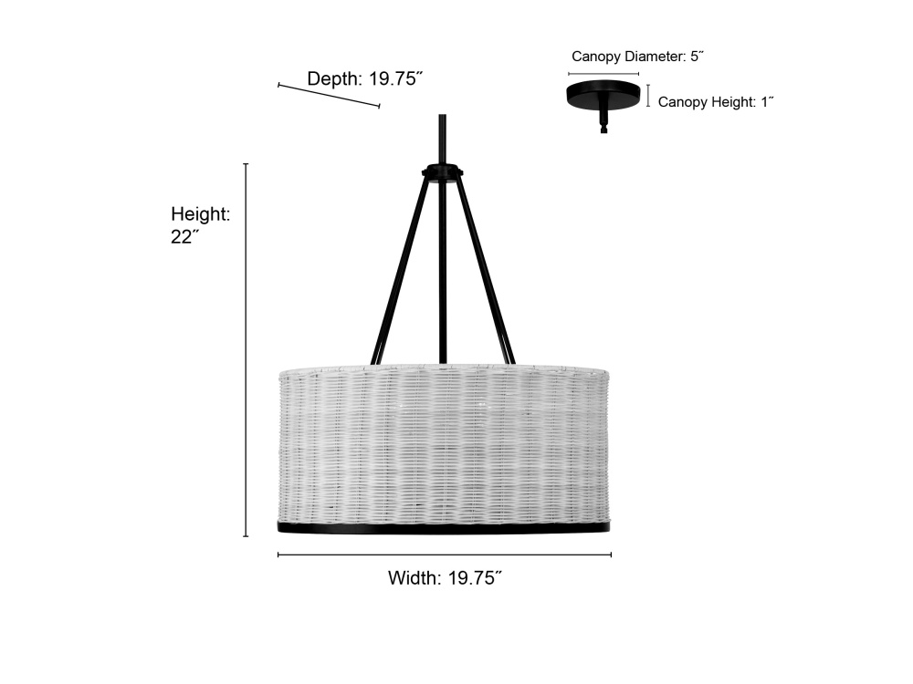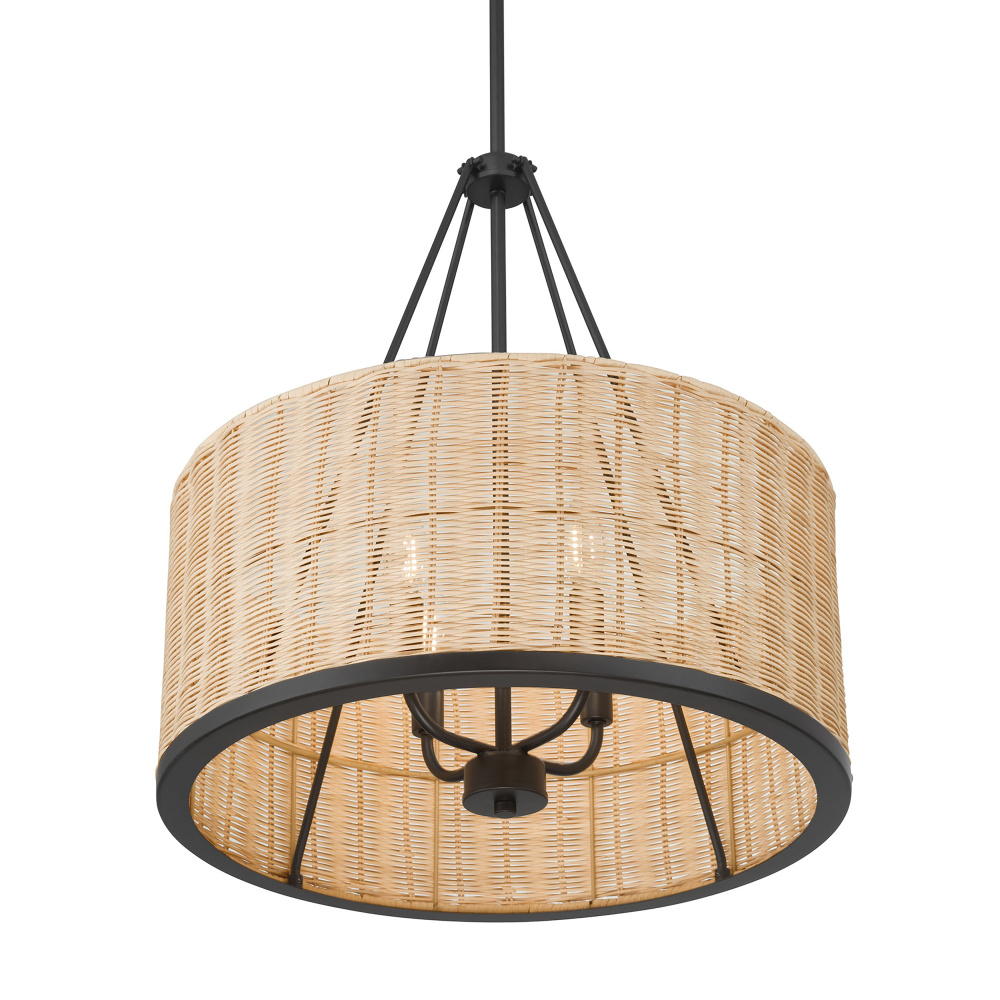 The classic appeal of wicker is thoroughly elevated with the Namiro Collection of pendant lighting. The geometric structure of the fixtures, finished in matte black, perfectly frames the drum shaped shade providing glowing illumination throughout any space from beach house to transitional modern. It’s the perfect design accent for dining, entryway or bedroom and is available as a 4 or 6-light pendant.