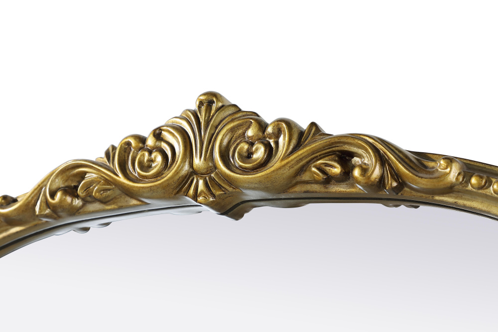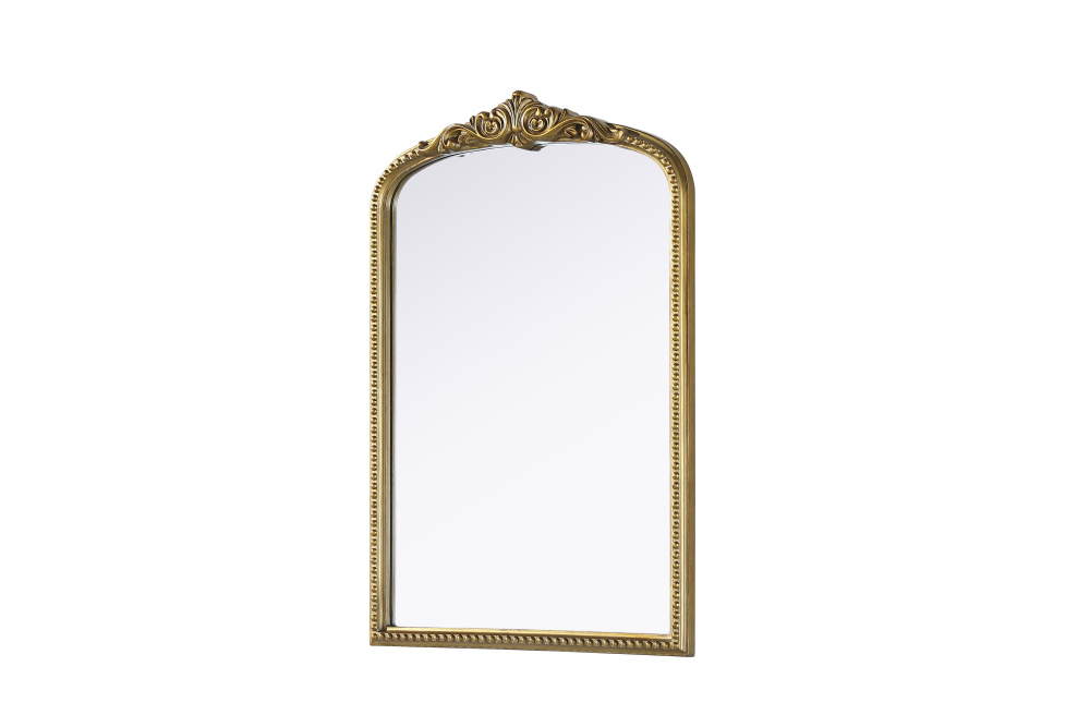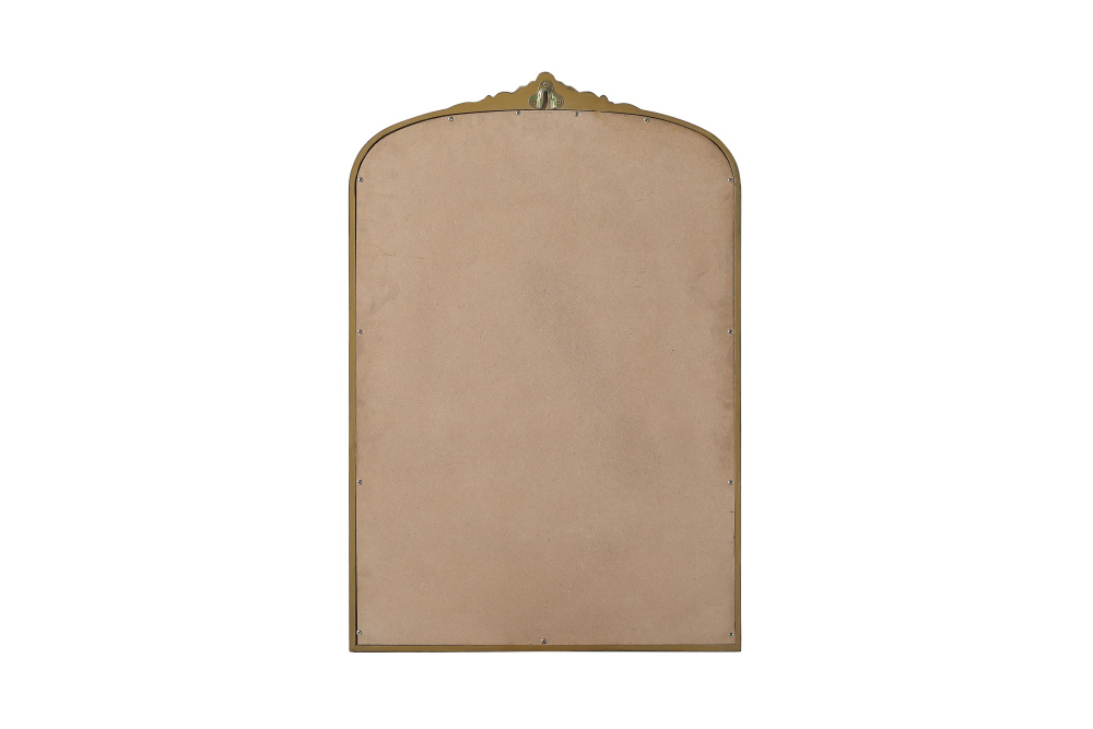 Add a touch of old-world charm to your home with this antique brass arched wall mirror, designed to bring timeless elegance and vintage character to any space. The hand-painted distressed finish gives the frame an aged, classic appeal, while the ornate crest and intricate detailing add a traditional European touch. Crafted from resin with an MDF backing board, this mirror is both lightweight and durable. Designed for vertical hanging only, it features a single metal inset hanger for easy wall mounting (hardware not included). Whether placed above a fireplace mantel, in an entryway, or as an accent piece in a living room, this mirror creates a refined focal point. Available in multiple sizes and an alternative vintage bronze finish, it complements a variety of interiors, from classic and French country to vintage-inspired spaces.