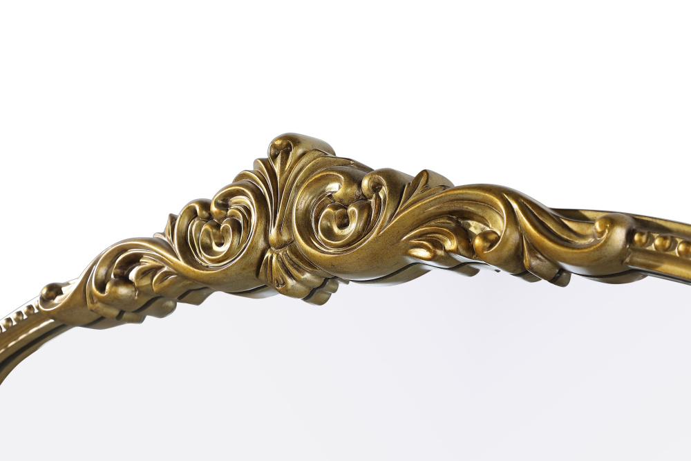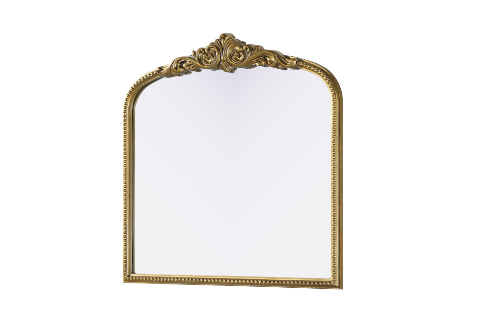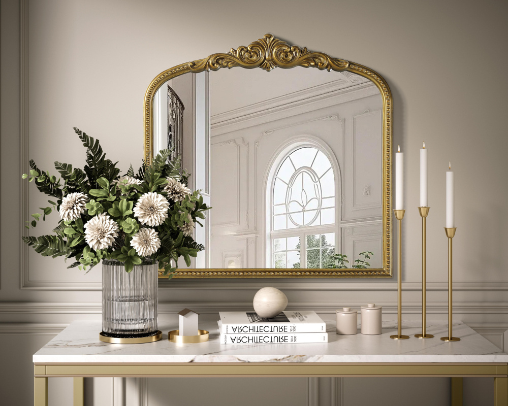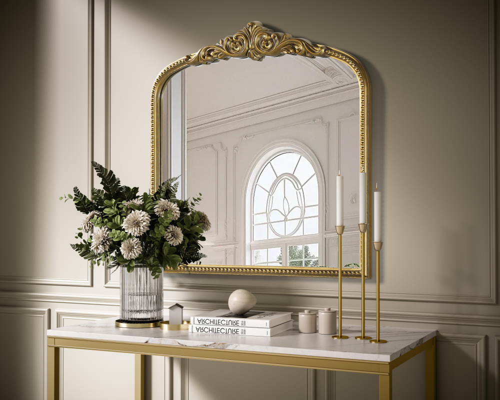 Add a touch of old-world charm to your home with this antique brass arched wall mirror, designed to bring timeless elegance and vintage character to any space. The hand-painted distressed finish gives the frame an aged, classic appeal, while the ornate crest and intricate detailing add a traditional European touch. Crafted from resin with an MDF backing board, this mirror is both lightweight and durable. Designed for vertical hanging only, it features two metal inset hangers for easy wall mounting (hardware not included). Whether placed above a fireplace mantel, in an entryway, or as an accent piece in a living room, this mirror creates a refined focal point. Available in multiple sizes and an alternative vintage bronze finish, it complements a variety of interiors, from classic and French country to vintage-inspired spaces.
