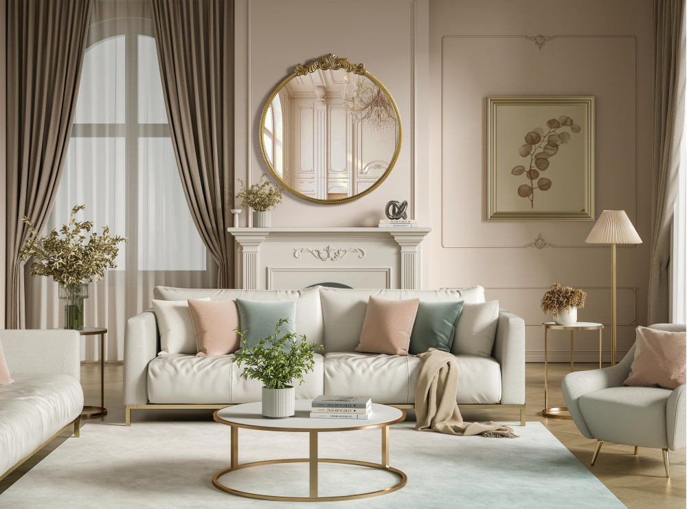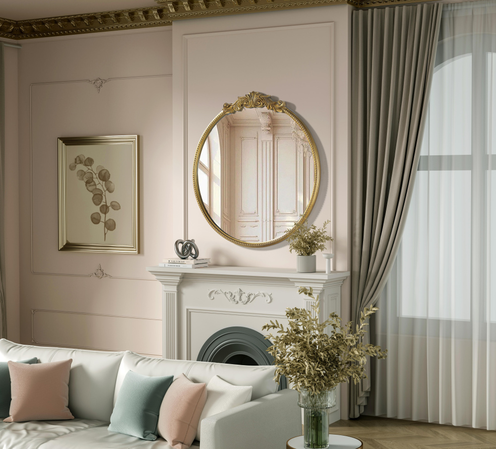 The circular frame is accented with an ornate floral and scroll crest, adding a refined, vintage-inspired touch.