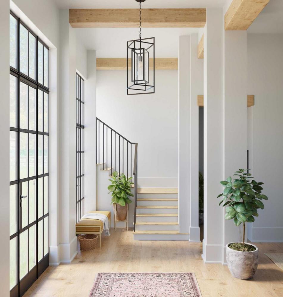 Define your favorite gathering spaces with the Navarre Collection 1-Light Matte Black Seeded Glass Transitional Outdoor Hanging Pendant Light. Several rectangular cubes nest within each other, forming a breezy angular silhouette coated in a classic matte black finish. Shimmering seeded glass panels cast a pleasing glow from the light source inside.
