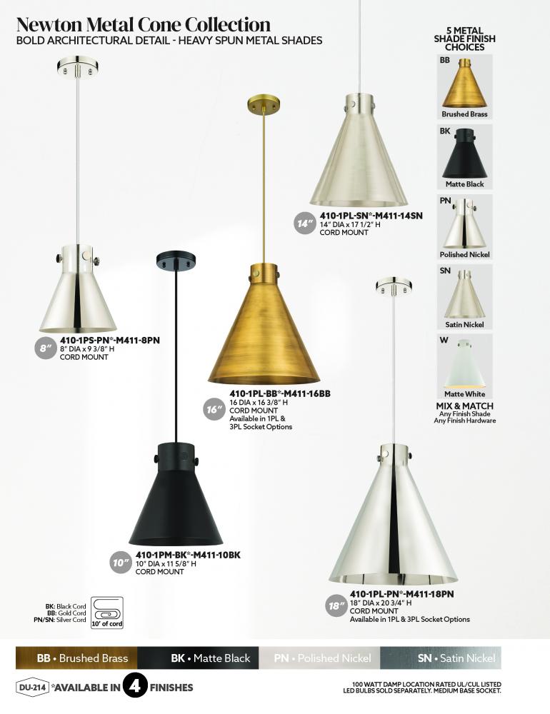 The Newton Cone is a modern industrial collection that incorporates exceptional architectural details and an equally striking cone shaped shade. The geometric shape of the glass or metal shade give this collection a charming and timeless presence.