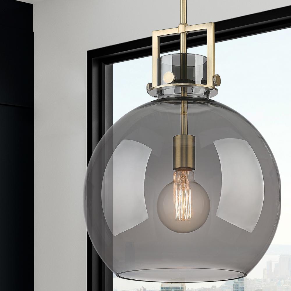 Newton Sphere - 1 Light - 14 inch - Brushed Brass - Light Smoke Shade - Pendant