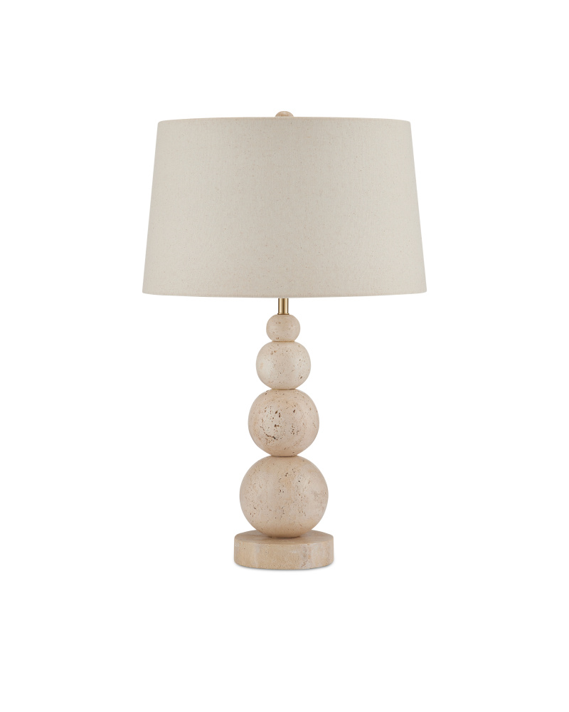 Made of natural travertine, the Niobe Table Lamp has a whimsical profile created by the graduating stacked balls that rise from a disc base of the same material. The texture of the beige lamp is enhanced by the flecks in the flax linen shade. Because this beige lamp is made of natural stone, texture and color may vary from lamp to lamp.
