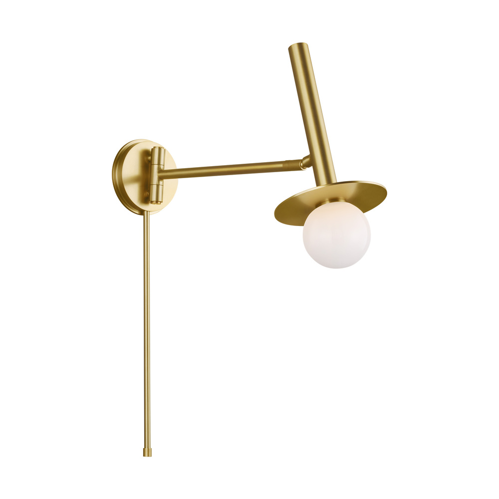 Nodes task, ceiling and wall lighting is minimal yet bold, highlighting Kelly's distinctive juxtaposition of mixed-materiality and curvilinear form. Light radiates from milk glass globes set against metal discs. All fixtures can be used or without the discs. The cast canopy is available in Burnished Brass or Midnight Black. Hanging fixtures within this family feature black fabric cords, while pivot sconces can be cord and plug or hard wire.