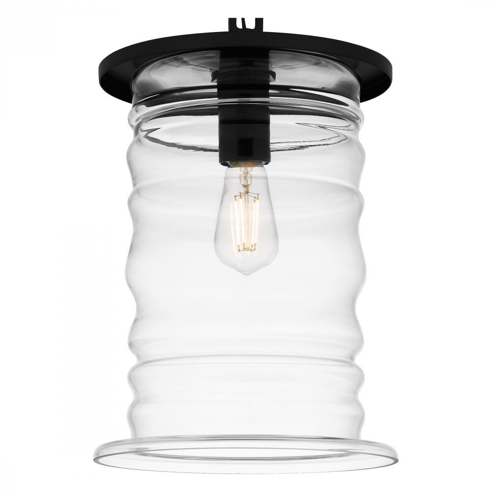 The Noland mini pendant light makes a beautiful addition to any homes exterior. Surrounded by a sleek matte black frame, the distinctive clear glass shade features a soft rippling design reminiscent of an ocean wave. Also available as an outdoor hanging la