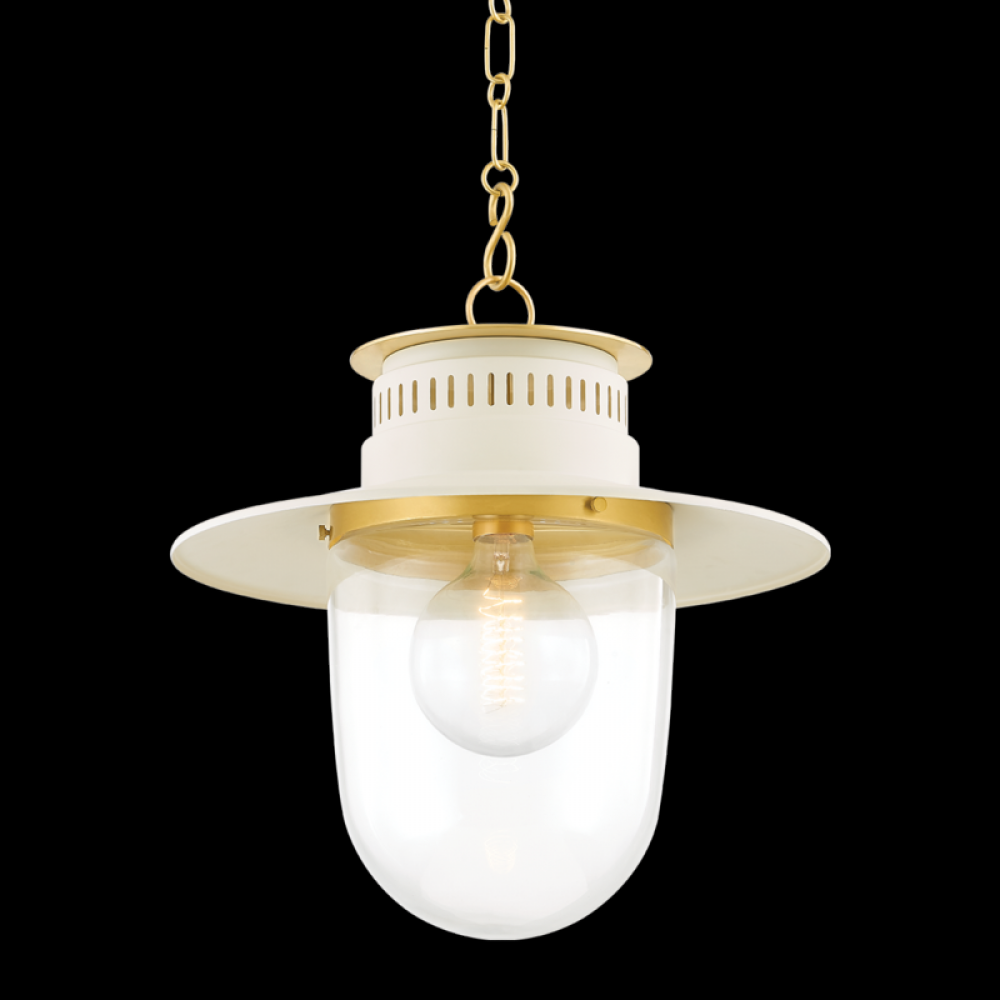 Tastefully revived for the modern home, the Nori Pendant blends vintage appeal with contemporary details beautifully. An intricate aged brass link chain holds a lantern-style frame, featuring sleek perforations at the base. The wide brim shade leads to more brass detailing and a clear glass dome. Also available in a smaller size.