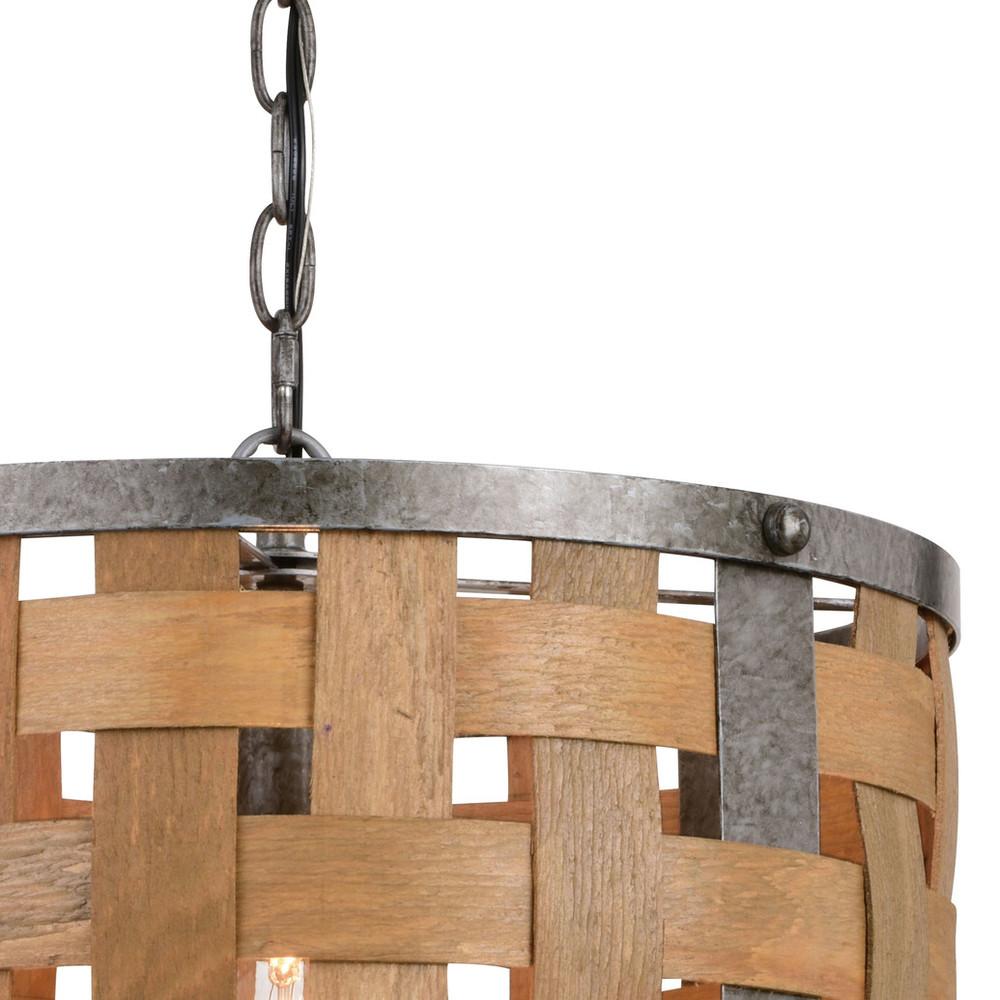 The urban loft beckons the unique basket weave Norwood pendant. Industrial inspired bands of steel and distressed wood are perfectly matched in this generously sized light that exudes the fixtures warmth and glory. This pendant is the perfect addition to any dining, entryway or living space.