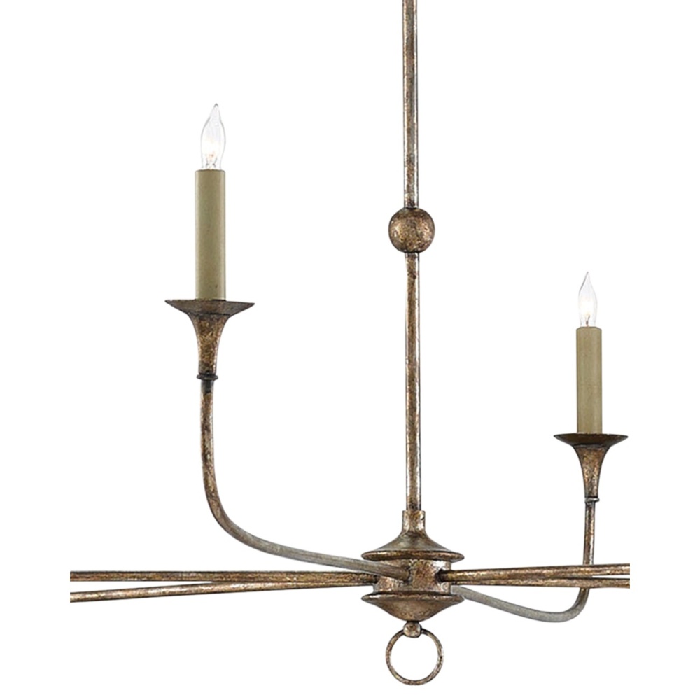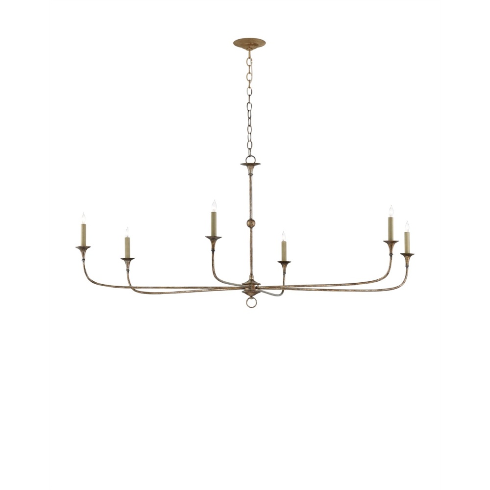Design notes on the Nottaway Bronze Large Chandelier include long arms that stretch gracefully from a small cog and a ring that ornaments its bottom-most point. The profile of the fixture has a lovely fluidity to it, and the Pyrite bronze finish adds textural interest to the bronze chandelier. Adjustable from 30.75" to 99.75" with use of included chain/rod kit/cable. If your space calls for a longer drop, additional chain/rods/cable is available for purchase.