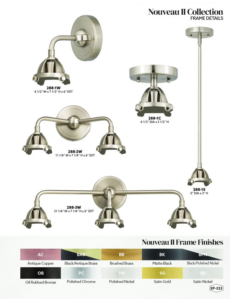 The Nouveau collection is comprised of heavy cast components with engraved lines that give the fixture an art deco look and feel. We offer the fixture in 10 finishes with over 100 possible metal and glass shade options that can change the style to fit any