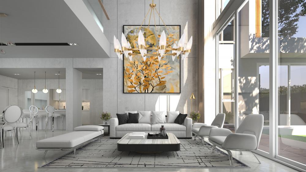 With its petals of handmade strie glass and Warm Brass finish, the Savoy House Nouvel 12-light chandelier blossoms like a gorgeous Art Deco-meets-contemporary flower. It will create a stunning focal point in any space. Nouvel is 45" in diameter and has an adjustable height ranging from 40" to 88". Comes with four 12" downrods and one 6" downrod. It uses twelve candelabra size bulbs of up to 60 watts per bulb. Bulbs not included.