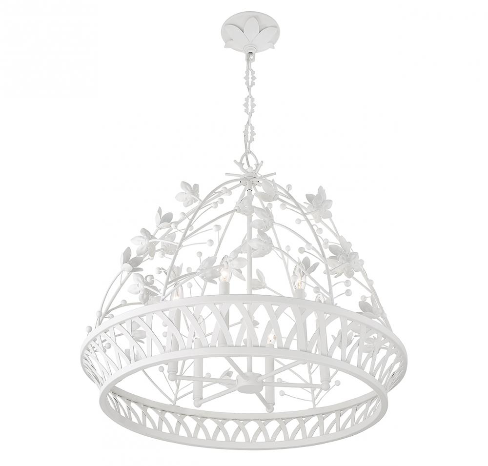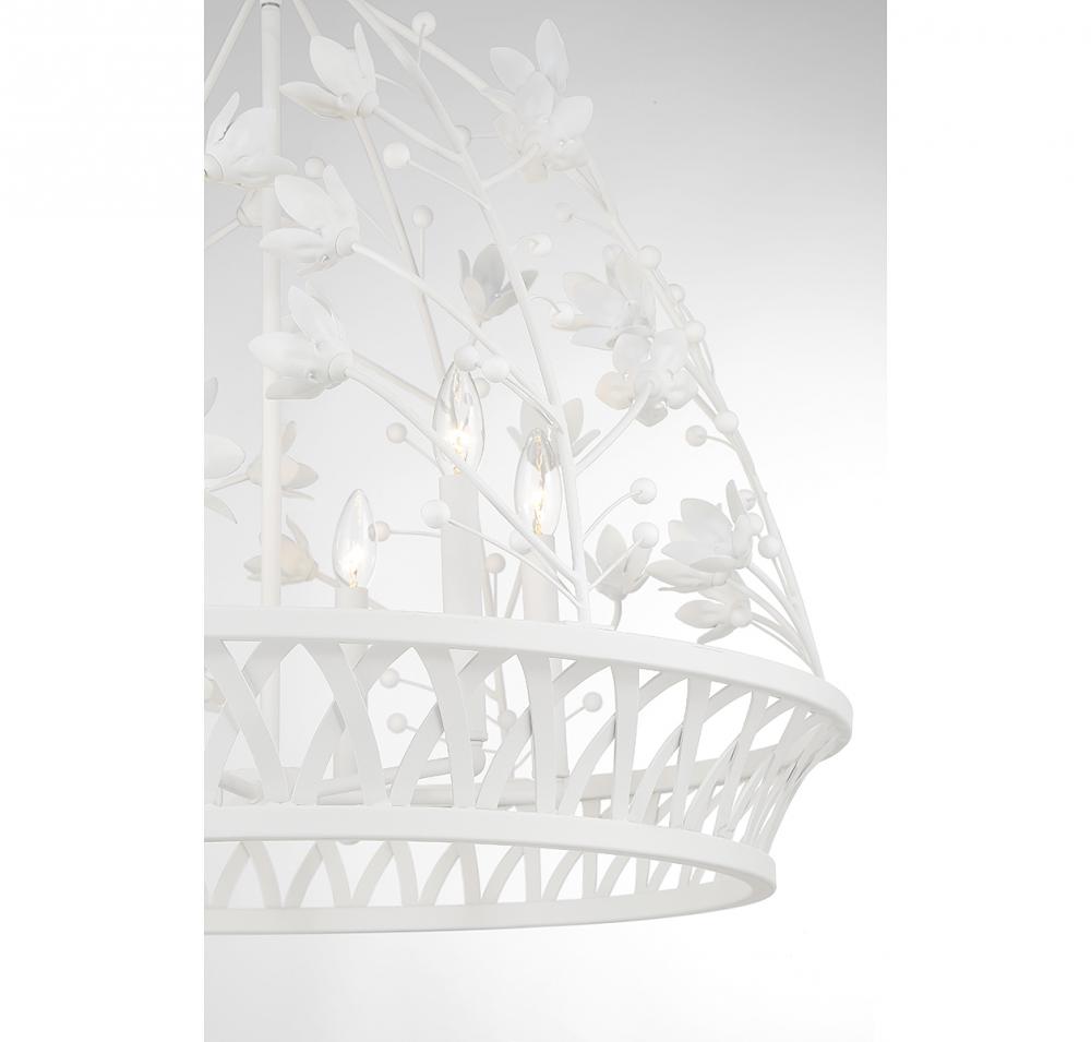 Add a little magic to any room with the whimsical Savoy House Oakmont 6-light pendant, which features a basket-like structure adorned with rows of lovely metal flowers finished in bisque white. It is 27” in height and 29” in width. It uses 6 candelabra size bulbs of up to 60 watts per bulb (bulbs not included).