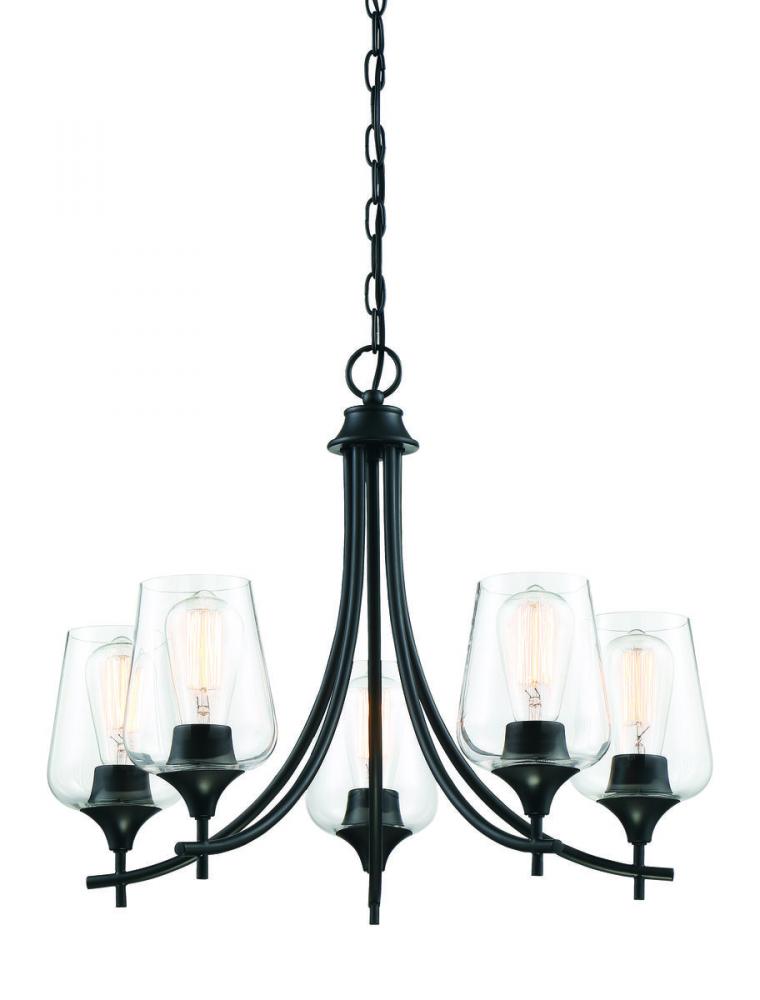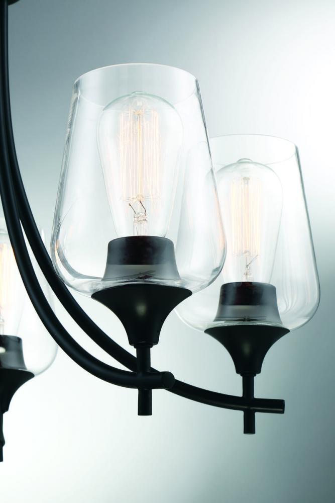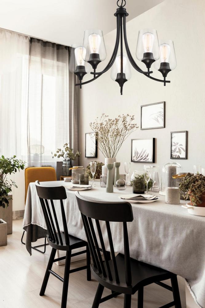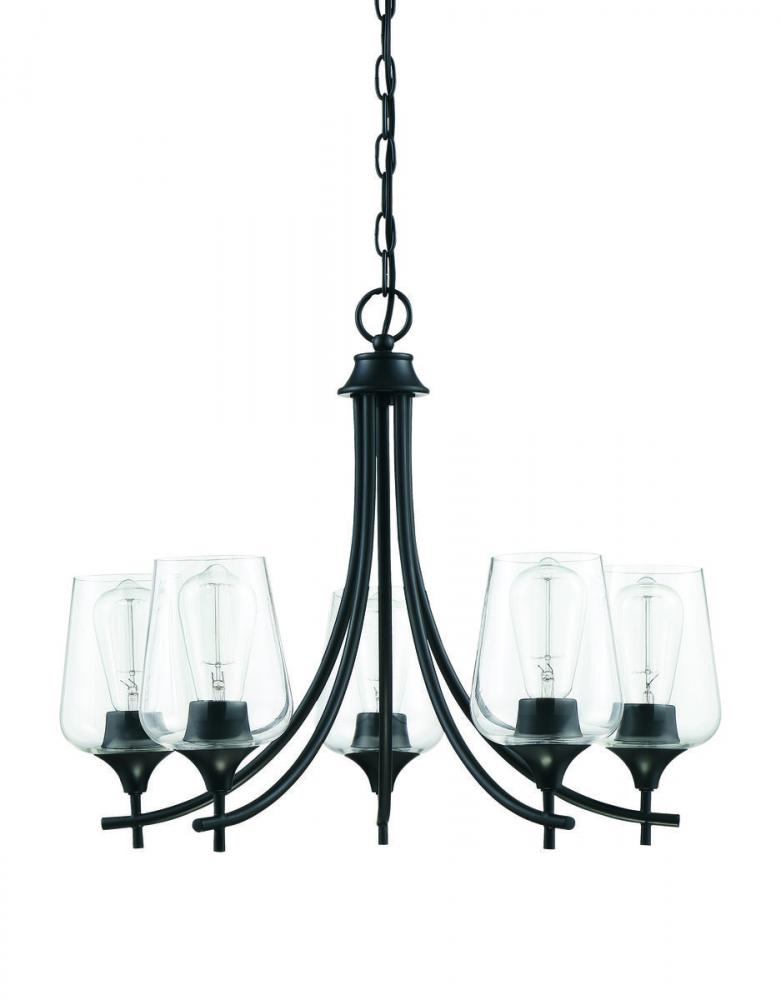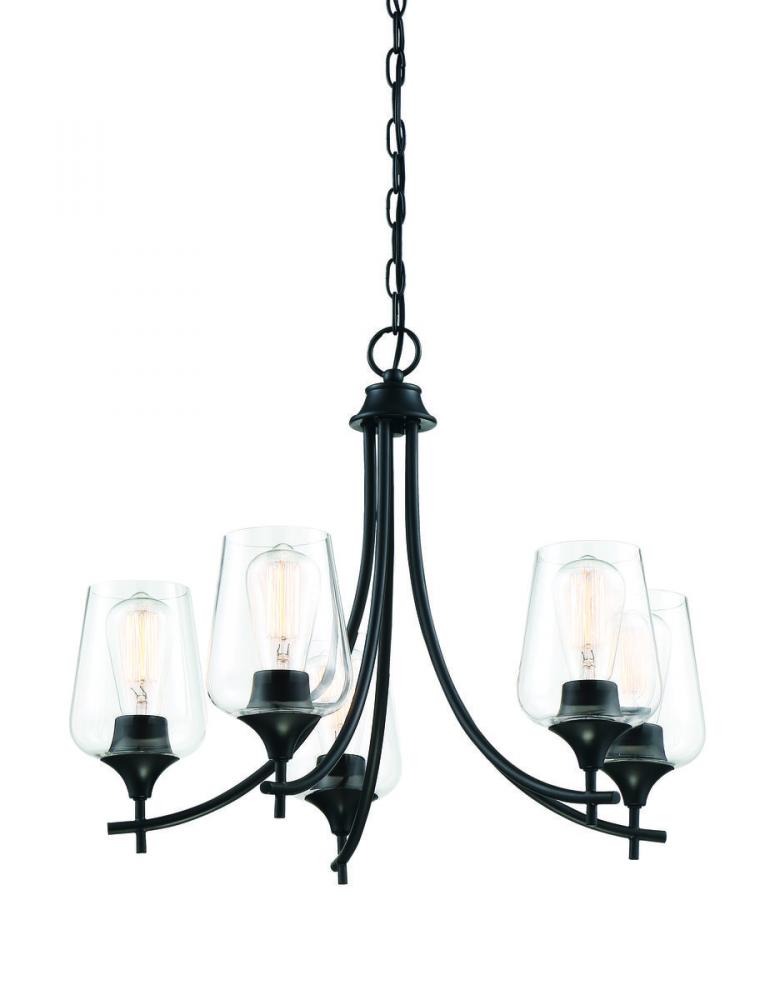 Bold black lines and a streamlined silhouette create an air of elegance and sophistication. The matte black finish and clear glass shades go with absolutely everything: any color palette, other finishes, and many different decor styles. If you have traditional, contemporary, transitional, vintage, modern farmhouse, industrial-inspired, or an eclectic mix in your home, you’ll love the way this Octave chandelier will stylishly fit right in. 23” wide by 18.5” high fixture connects with a chain to adjust hanging height. Curved arms hold curved glass shades for a graceful, uncluttered look. And five 60W bulbs will provide lovely illumination in your space, whether in a dining area, living room, entryway, or bedroom.