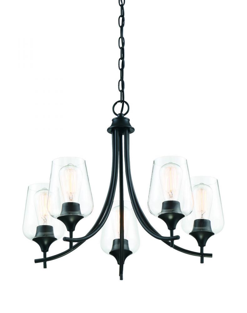 In the Savoy House Octave 5-light chandelier, bold black lines and a streamlined silhouette create an air of elegance and sophistication. The matte black finish and clear glass shades go with absolutely everything. If you have traditional, contemporary, transitional, vintage, modern farmhouse, industrial-inspired or an eclectic mix in your home, you’ll love the way this Octave chandelier will stylishly fit right in. This 23" wide by 18.5" high fixture connects with a chain to adjust hanging height. Curved arms hold curved glass shades for a graceful, uncluttered look. Five standard-size bulbs will provide lovely illumination in your space, whether in a dining area, living room, entryway or bedroom.