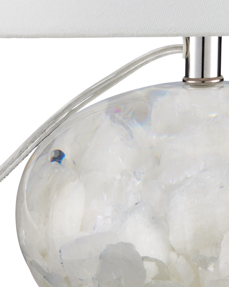 The blossoming cloud-like formations contained in the orb-shaped body of the Odette White Table Lamp were formed when quartz was encased in clear composite. Contributing to the brightness of this design is the polished nickel hardware that rises to disappear under the clean-lined shade. Because this is an artisanal piece, no two of the Odette lamps will be exactly alike.