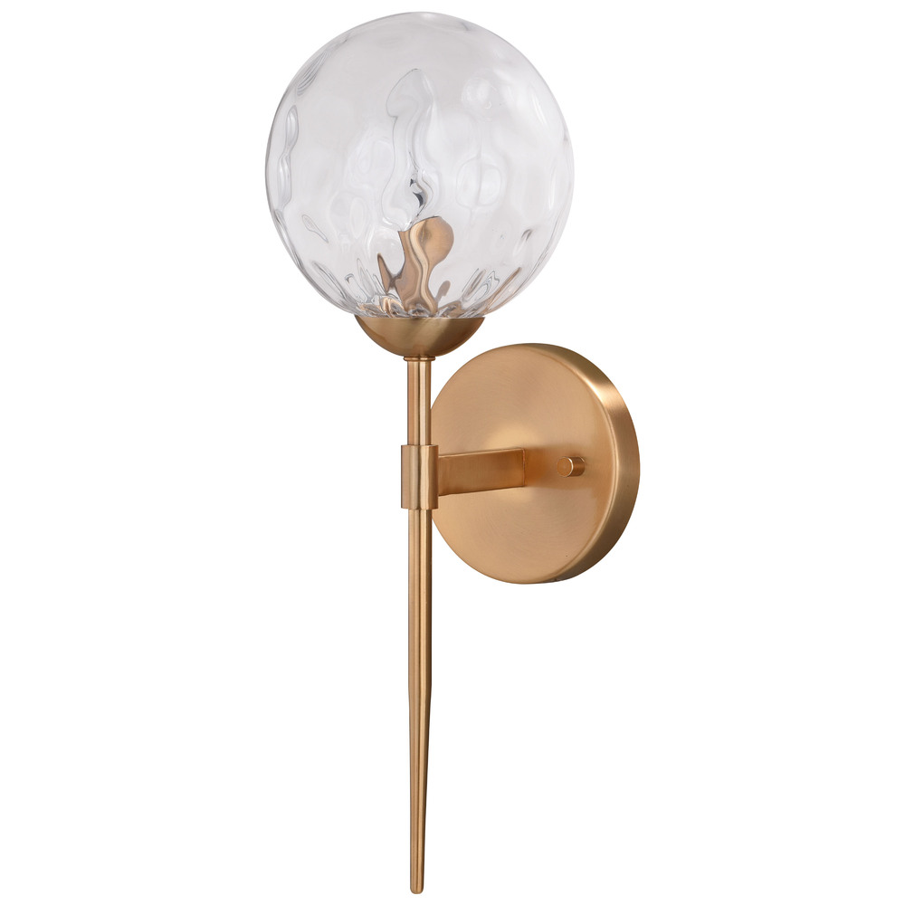 The Olson is a new take on a familiar mid-century modern design. The dimpled clear globe glass shade is supported by a sleek gold toned rod. Combine that with a vintage Edison style filament bulb to complete the look. This wall sconce is ideal for bathrooms, hallways, stairways, foyers, and more.