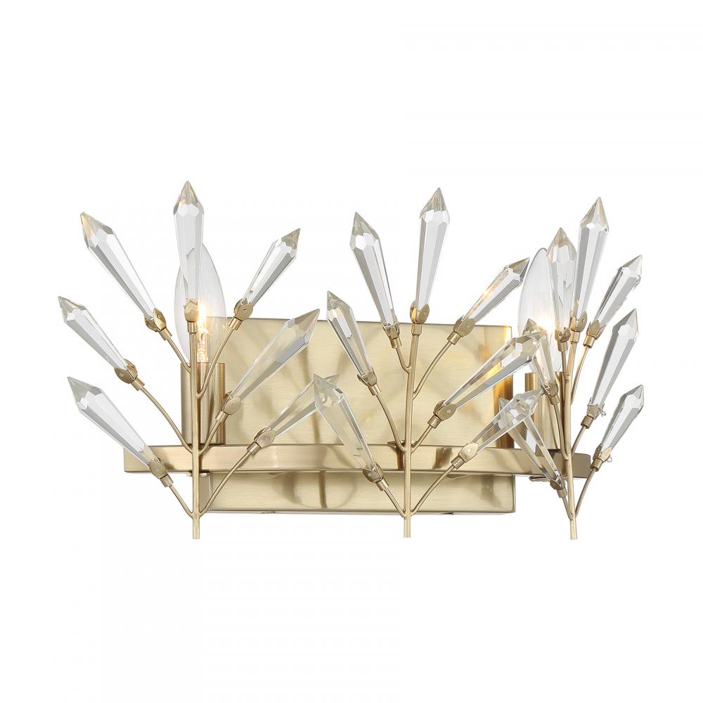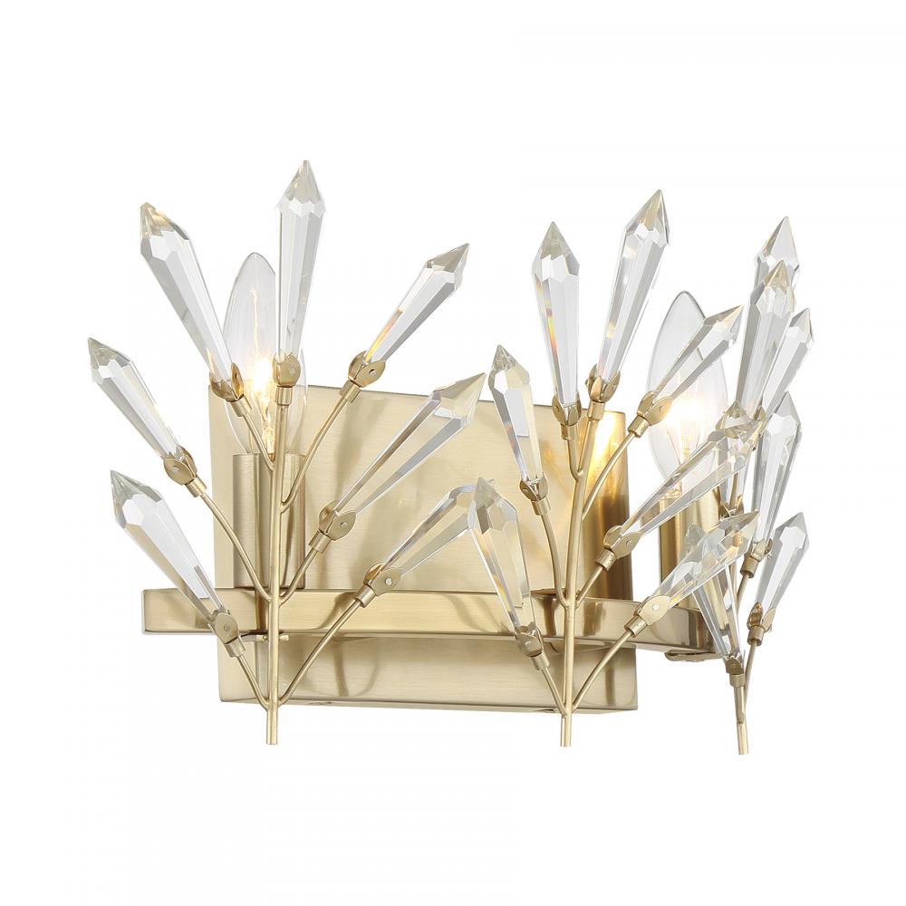 Decorate your home with the beautiful, nature-inspired Savoy House Orianna 2-light bath light. Its frame holds slim branches that are adorned with icicle-cut clear crystal accents. They glint and glimmer when illuminated and make a perfect match with the Noble Brass finish. Orianna is 8" in height, 14.5" in width and extends 5.5" from the wall. Uses two candelabra size bulbs of up to 60 watts per bulb. Bulbs not included. Mount as pictured. This bath bar is damp area rated.