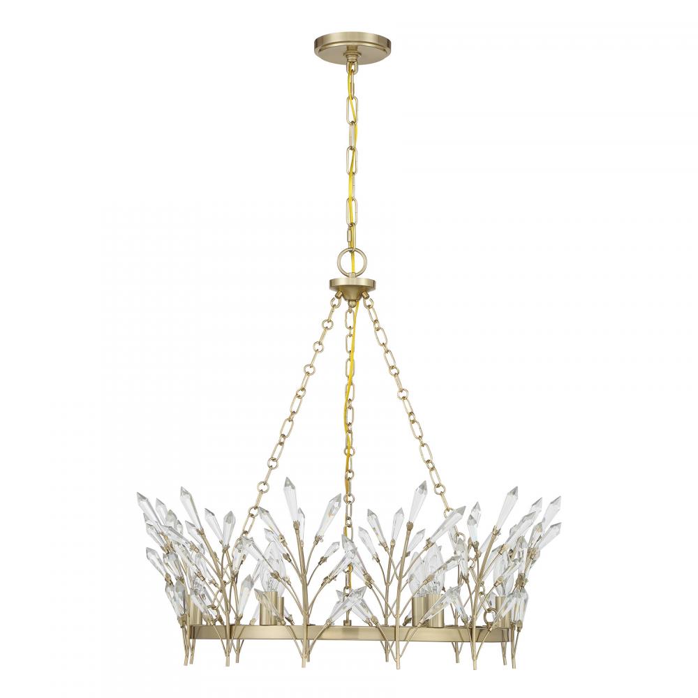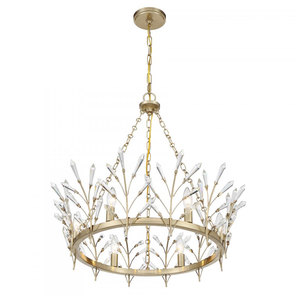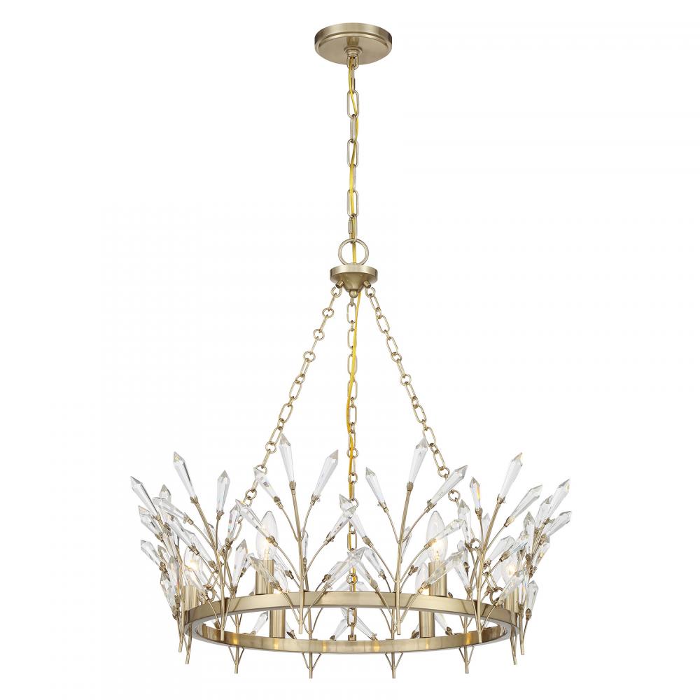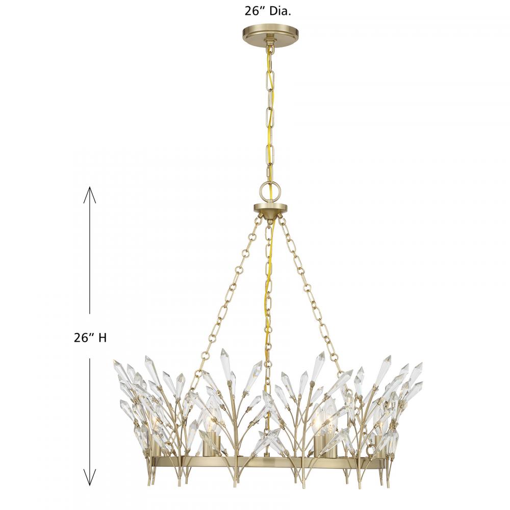 Crown your home with the beautiful tiara that is the Savoy House Orianna 6-light chandelier. Its round, open frame holds slim branches that are adorned with icicle-cut clear crystal accents. They glint and glimmer when illuminated and make a beautiful match with the Noble Brass finish. Orianna is 26" in height and 26" in width. It uses six candelabra size bulbs of up to 60 watts per bulb. Bulbs not included. Comes with 120" of chain.