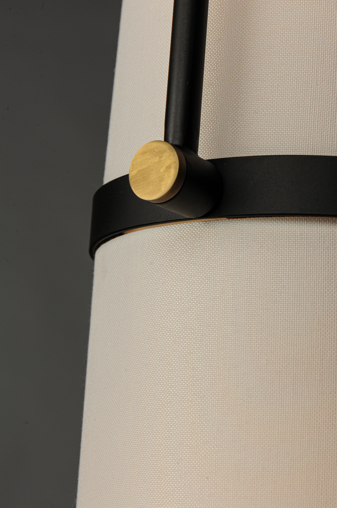 A unique collection featuring back to back Off-White fabric shades mounted to a frame of Bronze with Antique Brass accents. The adjustable mount allows you to direct the light where you most need it.