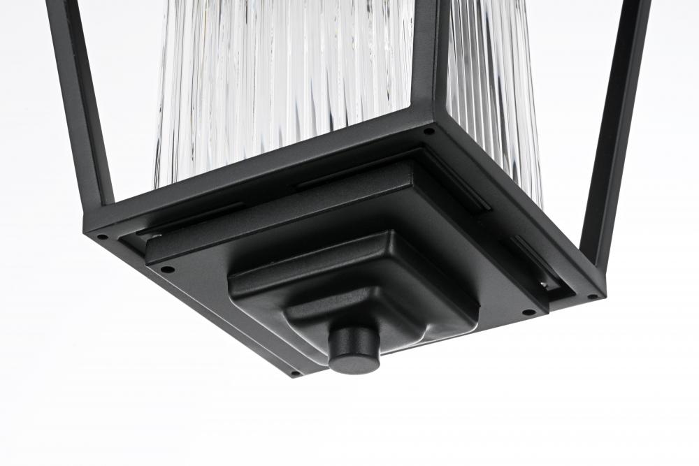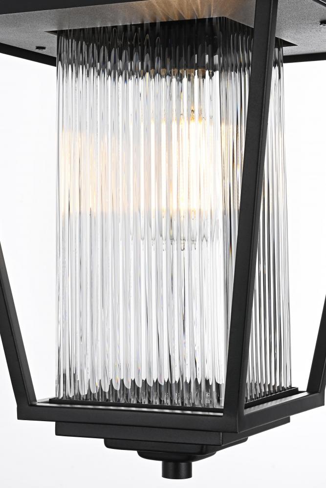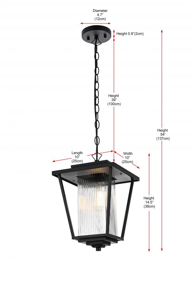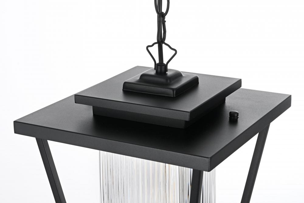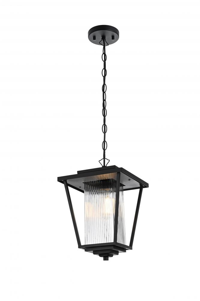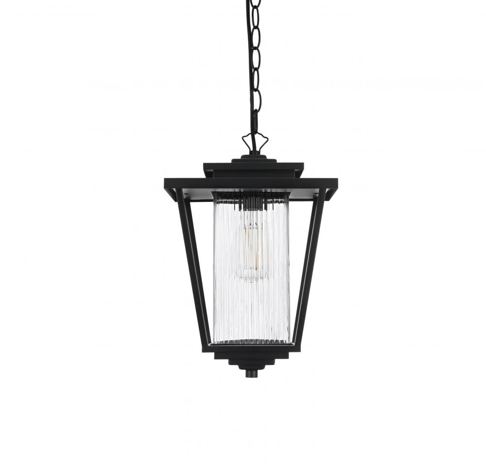 Illuminate your outdoor spaces with the timeless elegance of this outdoor pendant light. The lantern-style fixture features a sleek black finish and stunning fluted clear glass panels that create a soft, diffused glow perfect for patios, porches, or entryways. Its elegant tapered shape and durable metal construction bring both style and reliability to your exterior decor. The adjustable chain provides flexibility, making it easy to customize the height to suit your space. Designed with an open base, this pendant ensures easy bulb replacement and optimal illumination for a welcoming ambiance. Built to withstand the elements, it’s both a functional and visually appealing addition to your home’s exterior. Enhance your outdoor areas with the sophisticated charm of this black metal outdoor pendant.