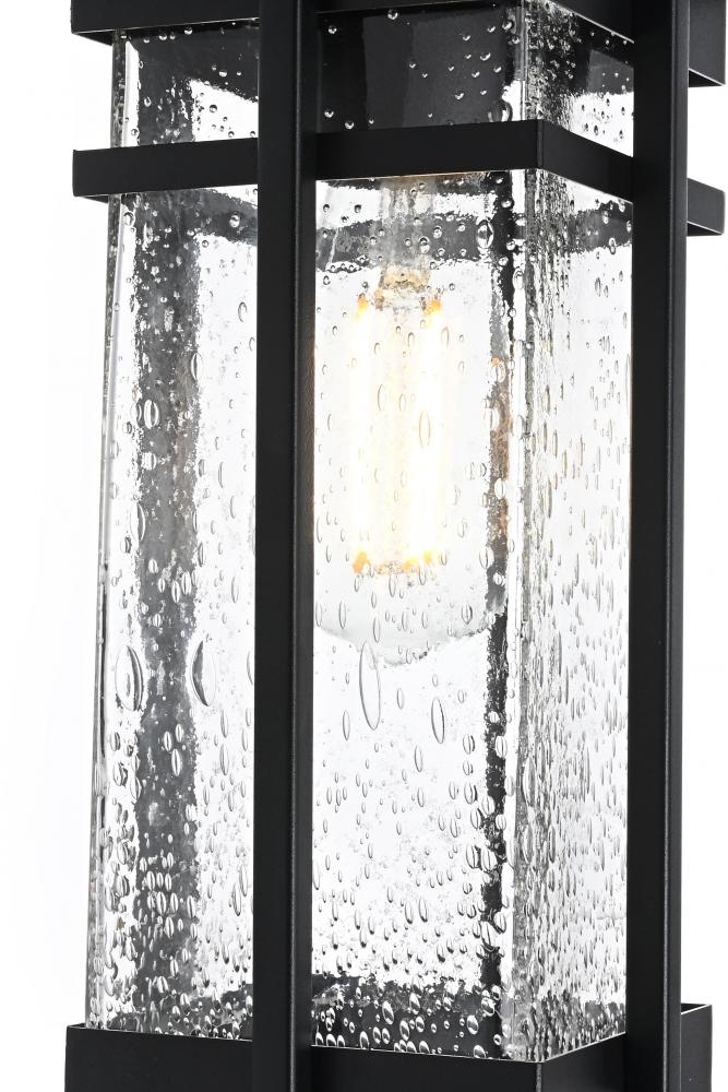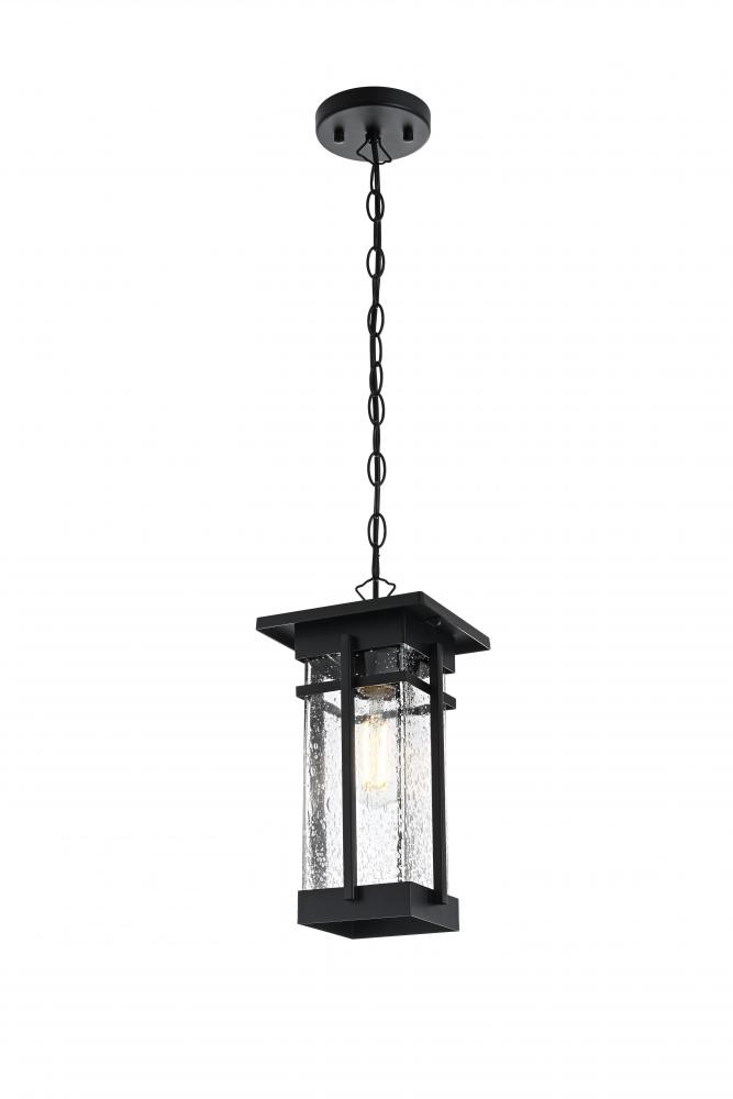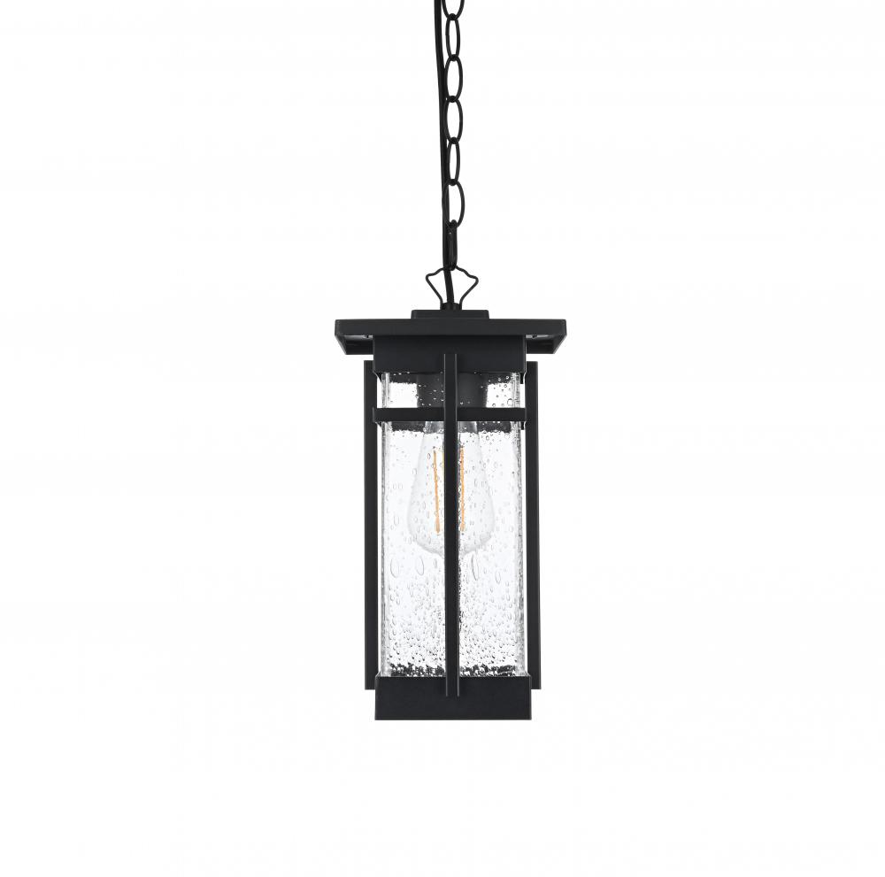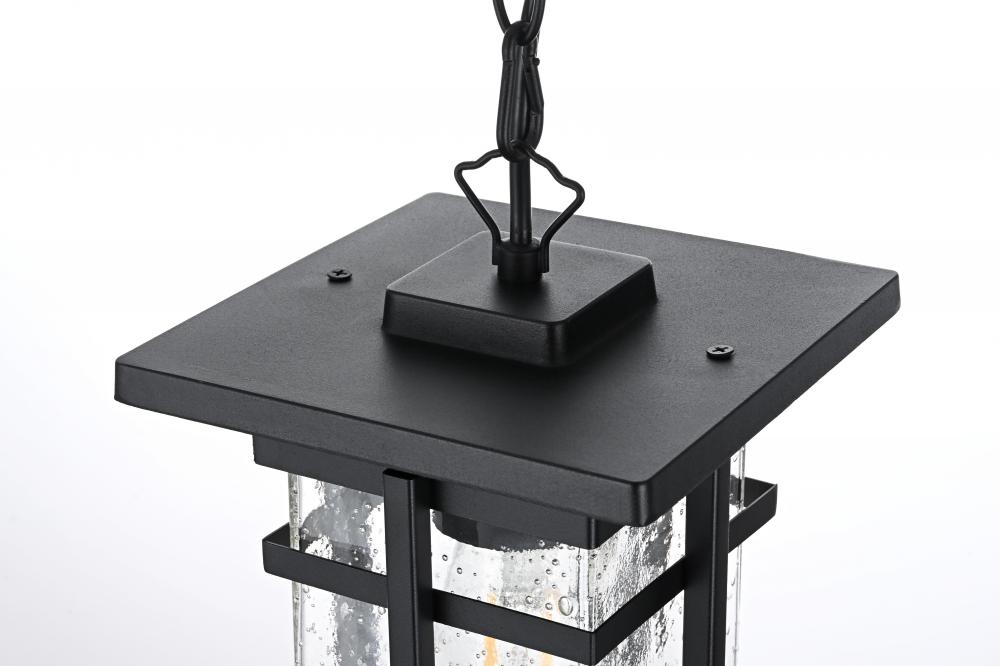 Transform your outdoor living spaces with the sleek elegance of this pendant light, designed to bring modern charm and functionality to your exterior decor. The stylish rectangular frame, finished in matte black, is paired with clear seeded glass panels that diffuse light beautifully, adding texture and inviting warmth to your porch, patio, or entryway. The visible bulb design enhances the pendant's overall appeal, making it perfect for use with decorative filament bulbs. with an adjustable chain for customizable height and weather-resistant construction, this pendant light is built to withstand the elements while providing a stylish glow. ETL certified for wet locations, it offers reliable performance in all outdoor conditions, making it a perfect choice to illuminate and elevate your outdoor spaces.