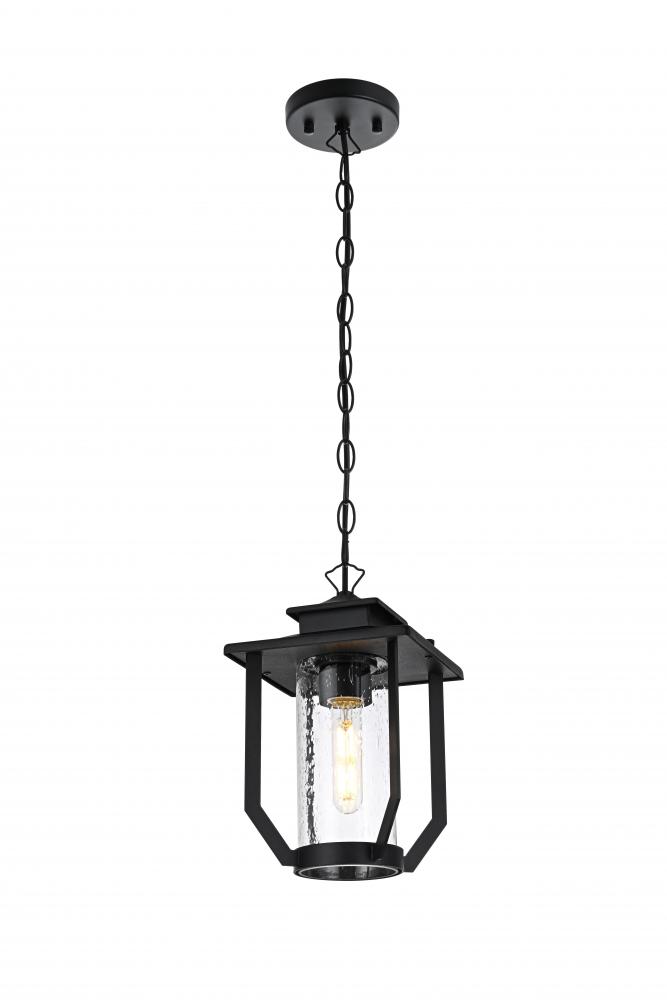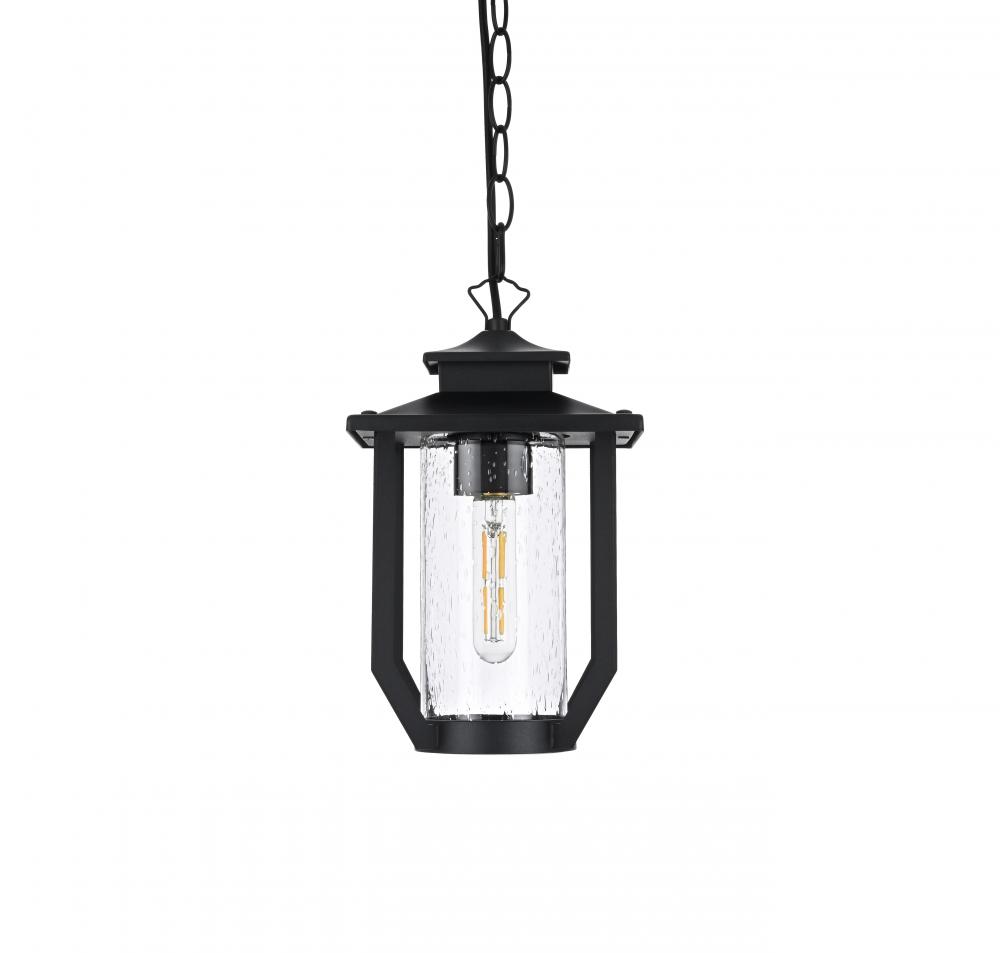 Elevate your outdoor decor with this stunning geometric outdoor pendant light. Featuring a unique open-frame design with sleek angular arms and a clear seeded glass shade, this pendant offers a striking mix of modern and classic aesthetics. The matte black finish gives it a versatile charm, fitting well with any style of exterior decor—from contemporary to rustic. The clear seeded glass adds texture and beauty, creating a soft, warm light that enhances your porch, patio, or entryway. Built with durable, weather-resistant metal and certified for wet locations, this pendant light is both stylish and built to last. The adjustable chain offers flexibility in hanging height, making it perfect for various outdoor settings. Illuminate your exterior spaces with elegance and charm, and create a welcoming atmosphere for guests and family alike.
