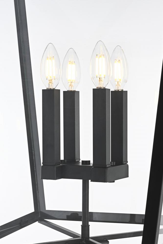 This outdoor post light is a beautiful embodiment of modern and classic design that perfectly complements any exterior home setting. Constructed from sturdy iron and clear glass, the light combines sharp architectural lines with a timeless lantern style, resulting in a statement fixture that enhances curb appeal. The angular matte black frame, topped by a stylish triangular loop, embraces an open, trapezoid-shaped structure with clear glass panels that reveal four E12 candelabra sockets. These sockets provide the ideal opportunity to incorporate flame-shaped bulbs for a warm, welcoming ambiance. Its classic look ensures versatility, making it a perfect addition to walkways, gardens, or patio posts, adding light where needed.