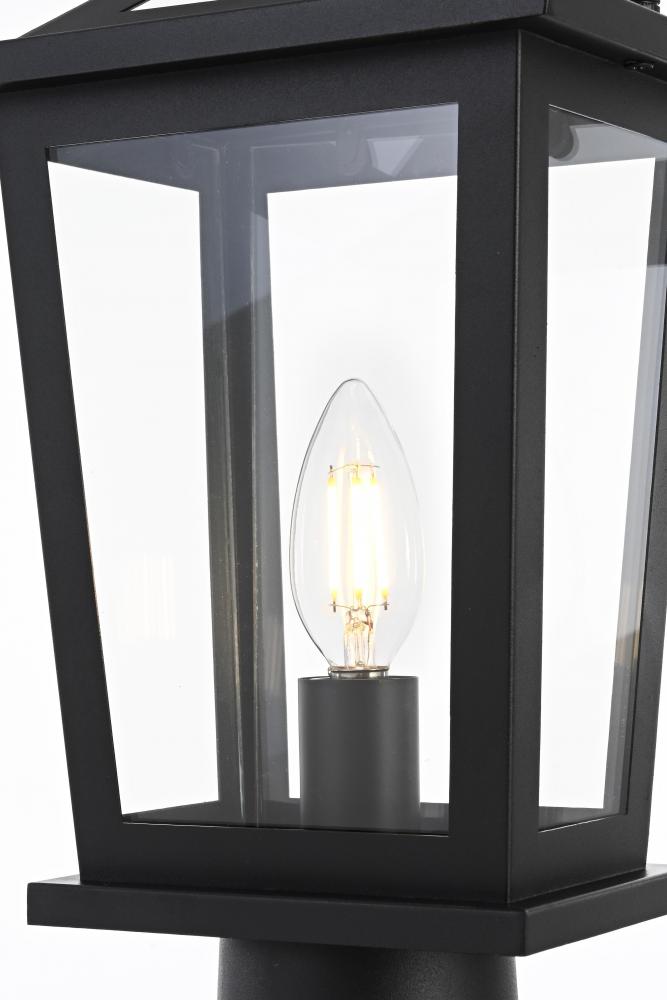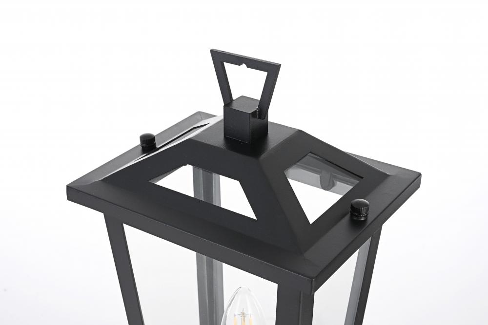 Enhance your outdoor space with this stylish post light that features a striking matte black frame paired with clear glass panels, perfectly showcasing its modern charm. The latern box shape is adorned with a distinctive triangular loop on top, adding a unique architectural touch that seamlessly combines functionality with a bold, sleek aesthetic. The open bottom design allows for easy bulb changes and casts a beautiful downward light, adding a welcoming glow to your entrance or patio area. Crafted from durable iron with a clean, modern style, this post light is perfect for those who appreciate a blend of simplicity and contemporary design. The clear glass ensures maximum light output, enhancing visibility while emphasizing the beautiful shape of the bulb inside. The E12 socket offers versatility for different bulb styles, allowing you to easily customize the ambiance of your outdoor area.