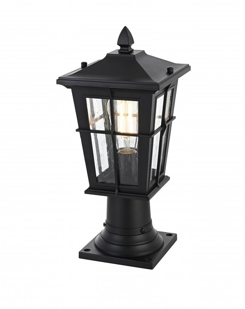 This outdoor post light is a striking blend of classic craftsmanship and contemporary functionality. Crafted from durable aluminum and encased with clear seeded glass, this light is both aesthetically pleasing and highly functional. The lantern-style design, featuring a cross-hatch metal framework and peaked roof, brings a timeless charm to your home's exterior. The seeded glass panels create a lovely diffusion of light, providing a warm and welcoming ambiance. with an E26 socket base, this light allows for versatile bulb options, adding further to its adaptable design. This post light seamlessly blends with various architectural styles, making it perfect for any outdoor area—from the front porch to backyard patios.