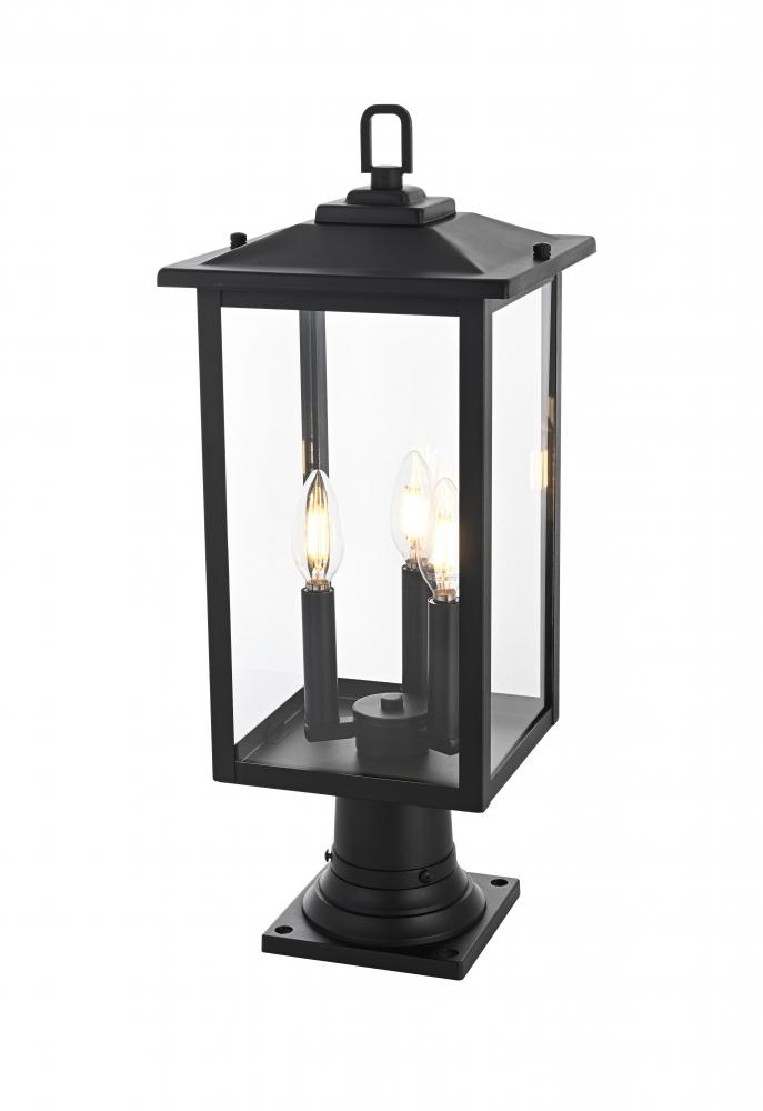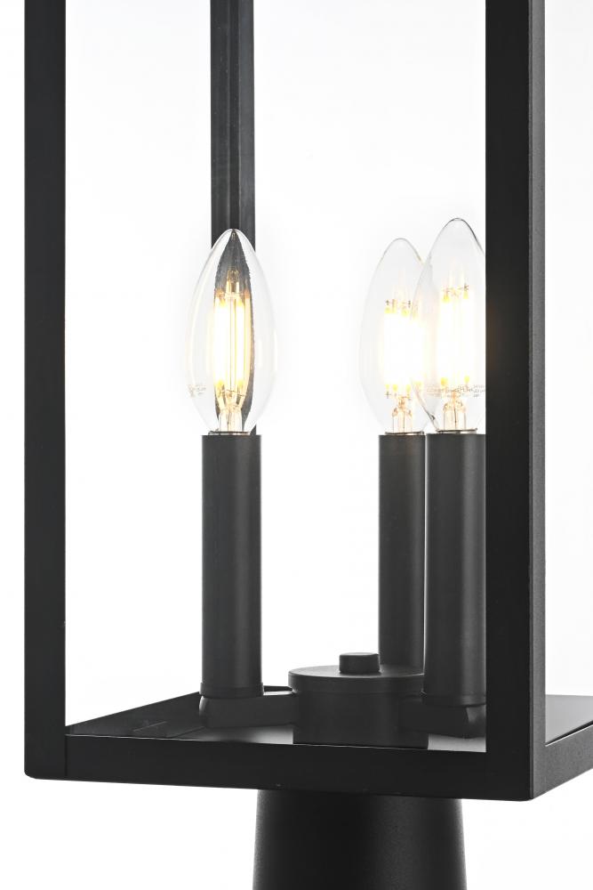 This outdoor post light, crafted from iron and glass, exudes a sophisticated balance between traditional charm and modern simplicity. The rectangular silhouette, clean lines, and sturdy frame make it a versatile addition to a range of exterior design styles. Featuring three E12 socket bases, it can accommodate candelabra bulbs, enhancing the vintage lantern appeal of the design. The clear glass panels showcase the beauty of the bulbs, creating a warm and inviting glow for patios, entryways, or garden spaces. Designed for outdoor durability, this post light not only enhances the aesthetics of your home but also provides essential lighting for a secure and welcoming atmosphere.