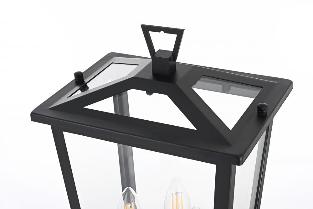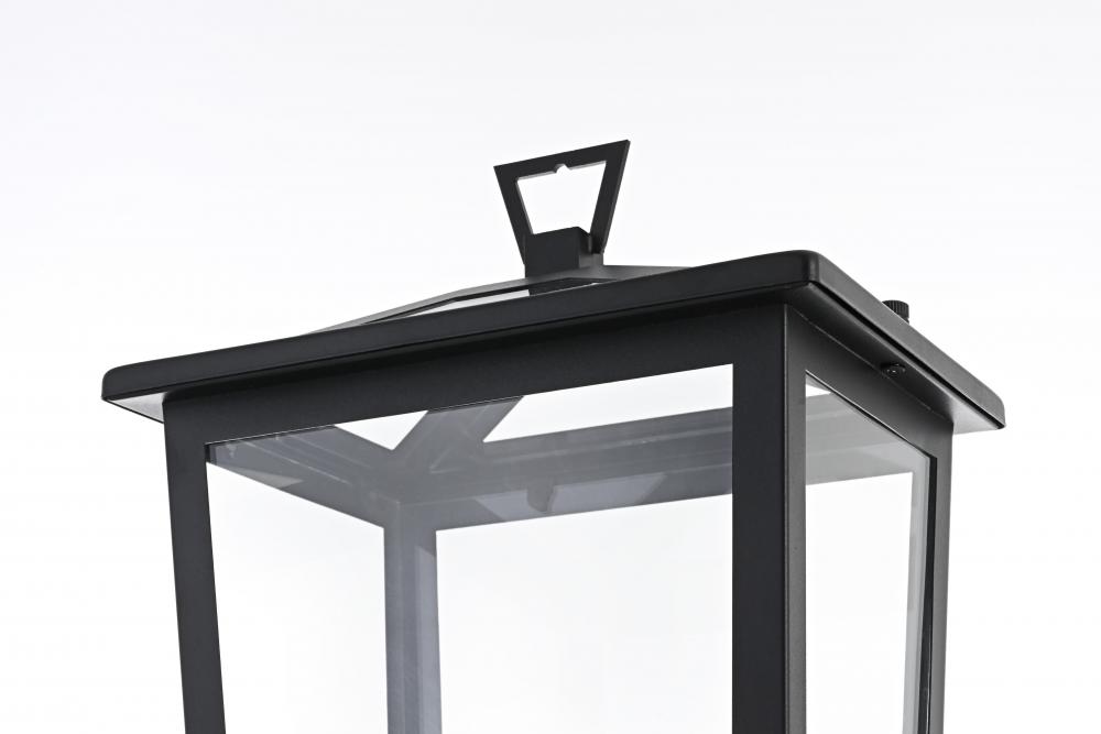 Enhance your outdoor space with this stylish post light that features a striking matte black frame paired with clear glass panels, perfectly showcasing its modern charm. The latern box shape is adorned with a distinctive triangular loop on top, adding a unique architectural touch that seamlessly combines functionality with a bold, sleek aesthetic. The open bottom design allows for easy bulb changes and casts a beautiful downward light, adding a welcoming glow to your entrance or patio area. Crafted from durable iron with a clean, modern style, this post light is perfect for those who appreciate a blend of simplicity and contemporary design. The clear glass ensures maximum light output, enhancing visibility while emphasizing the beautiful shape of the bulb inside. The E12 socket offers versatility for different bulb styles, allowing you to easily customize the ambiance of your outdoor area.